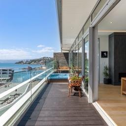 The north-eastern deck features a built-in spa pool overlooking the Marina, with views stretching across Clyde Quay to Oriental Bay and the city skyline. A secondary deck to the south captures summer sun and vibrant views over Waitangi Park, making this a home that truly lives with the landscape.