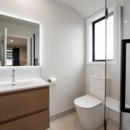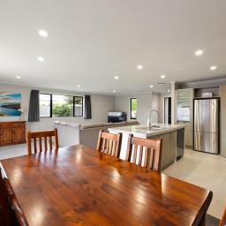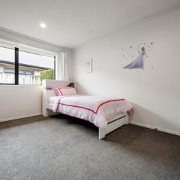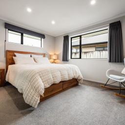 Comfort has been carefully considered, with double glazing, a DVS ventilation system with heater function to the bedrooms, and a heat pump supporting a warm, healthy living environment year-round. LED downlights throughout the bedrooms, living, kitchen and hallway enhance the home’s clean, modern feel.