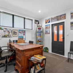 Positioned to the left, the residential home provides comfortable and versatile living with two double bedrooms, including a master with an ensuite and walk-in wardrobe, plus a potential third bedroom currently utilised as an office/reception area. The home also includes a family bathroom, open-plan living and dining, and a separate kitchen.