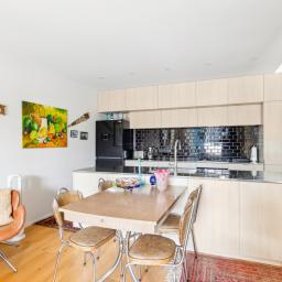 • Open-plan kitchen, living, and dining with custom built-in storage
