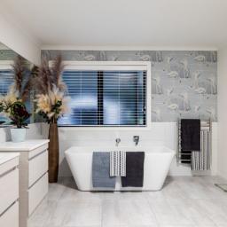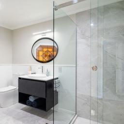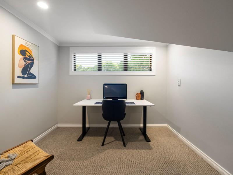 The master bedroom on the ground floor is a private retreat, opening onto its own patio and featuring a beautifully appointed ensuite with double vanity, freestanding bathtub, and walk-in shower — a space designed for comfort, style, and daily indulgence. A walk-in robe completes the suite, while a separate powder room services this level. Upstairs, three spacious bedrooms offer flexibility, including one with an office and reading nook. A bathroom with a walk-in shower and stained-glass window completes the upper level.