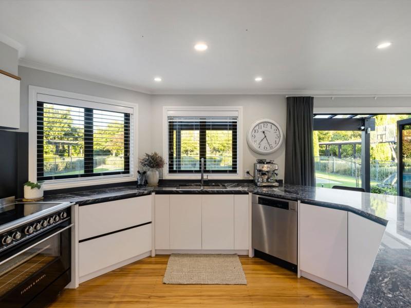 At the heart of the home, the kitchen is both practical and inviting. Granite benchtops, quality appliances, and generous storage are complemented by a window seat and woodburner, creating a space where the family naturally comes together.