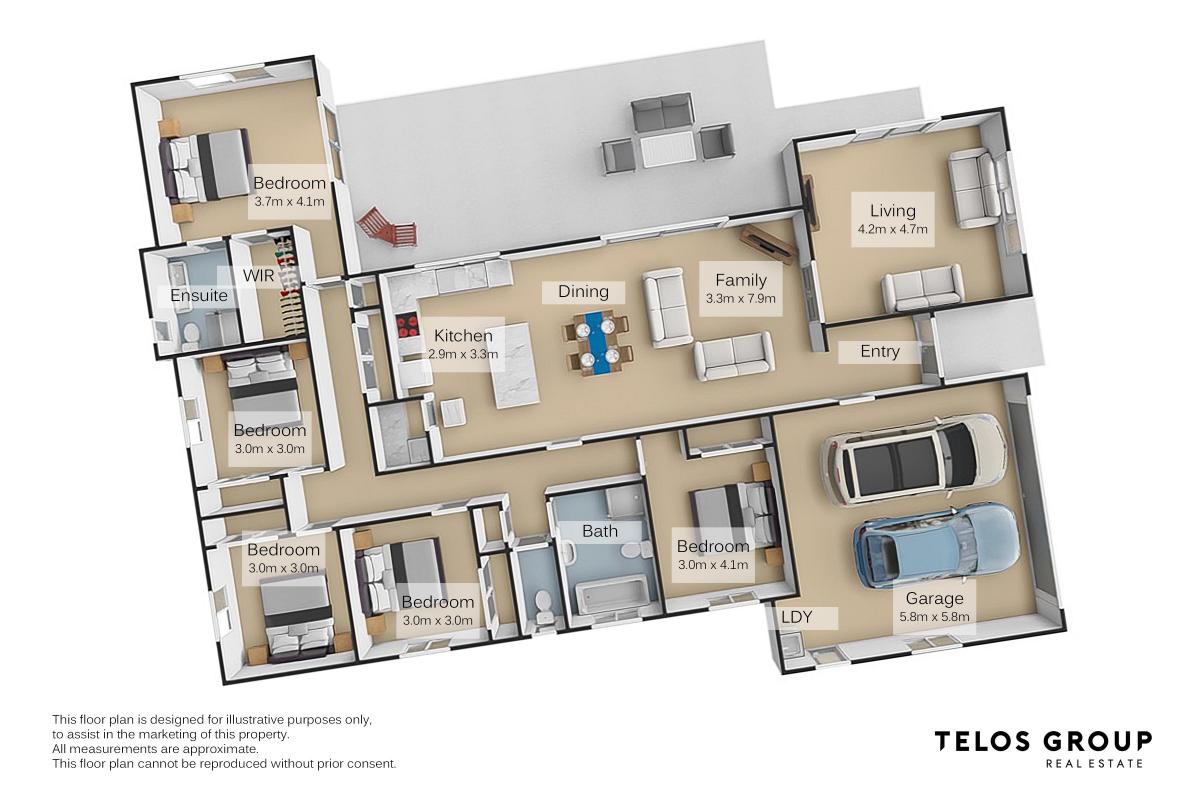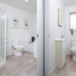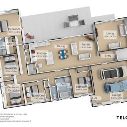 Accommodation is generous and well considered, with five double bedrooms providing peaceful personal retreats. The family bathroom includes a separate shower, bath, toilet and vanity, complemented by an additional separate WC. The privately positioned master suite opens outdoors and is enhanced by a walk-in wardrobe and ensuite. Abundant storage and a large double garage with integrated laundry complete the offering.