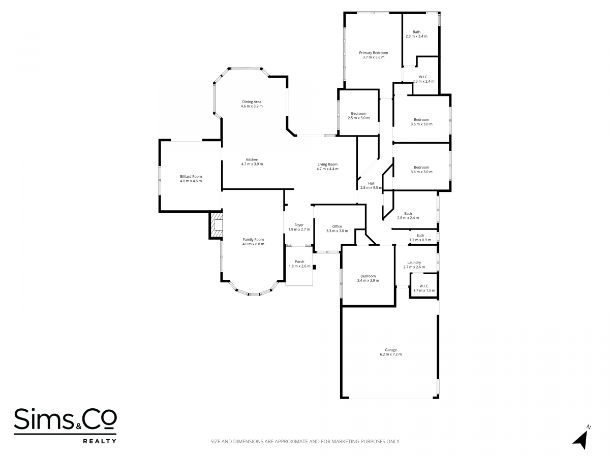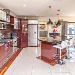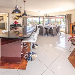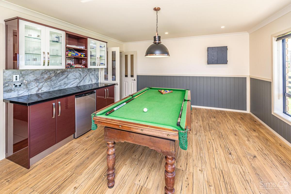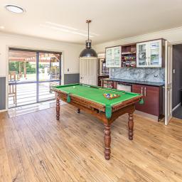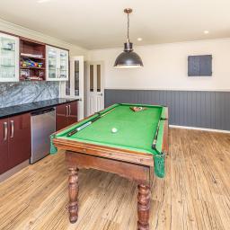 The open-plan kitchen and dining area forms the heart of the home, flowing seamlessly into a secondary entertaining zone complete with its own kitchenette—currently enjoyed as a billiards room and ideal for hosting on any scale.