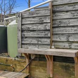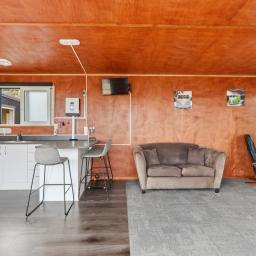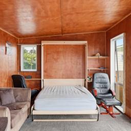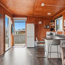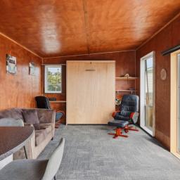 At the front of the property is the main cabin, housing the kitchen and living area - a relaxed, open space designed for comfort and practicality. A Murphy bed makes the most of the space, keeping things flexible whether you're here for a quick weekend or a longer summer stay.