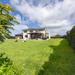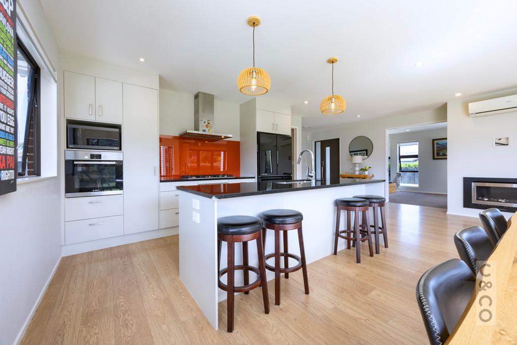 The home itself feels warm and welcoming, designed with easy family living in mind. The open-plan living, dining, and kitchen area flows seamlessly to the outside, where patios and lawns catch the sun at different times of day. A separate lounge offers a cosy retreat for movie nights or quiet evenings, while the generous kitchen, complete with quality appliances and excellent storage, makes entertaining simple.