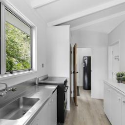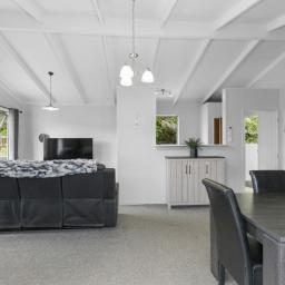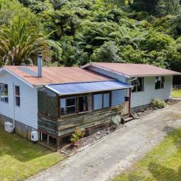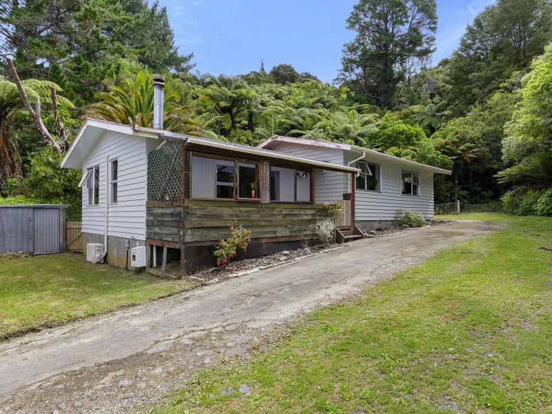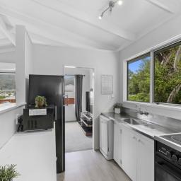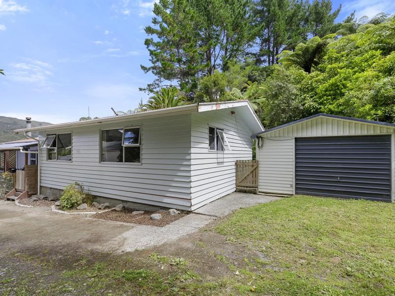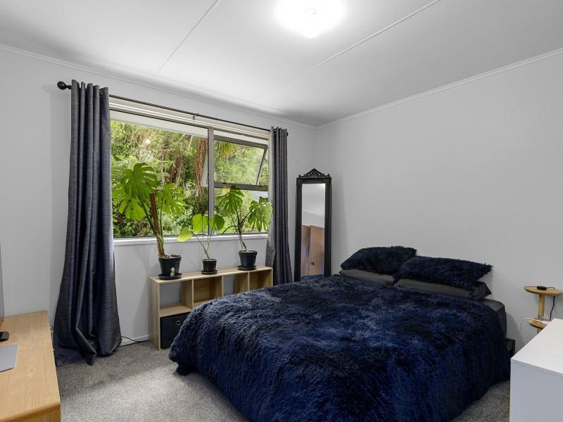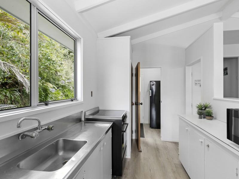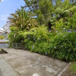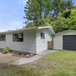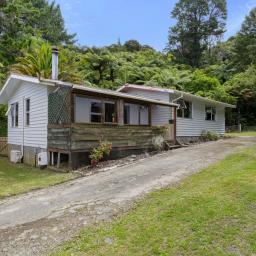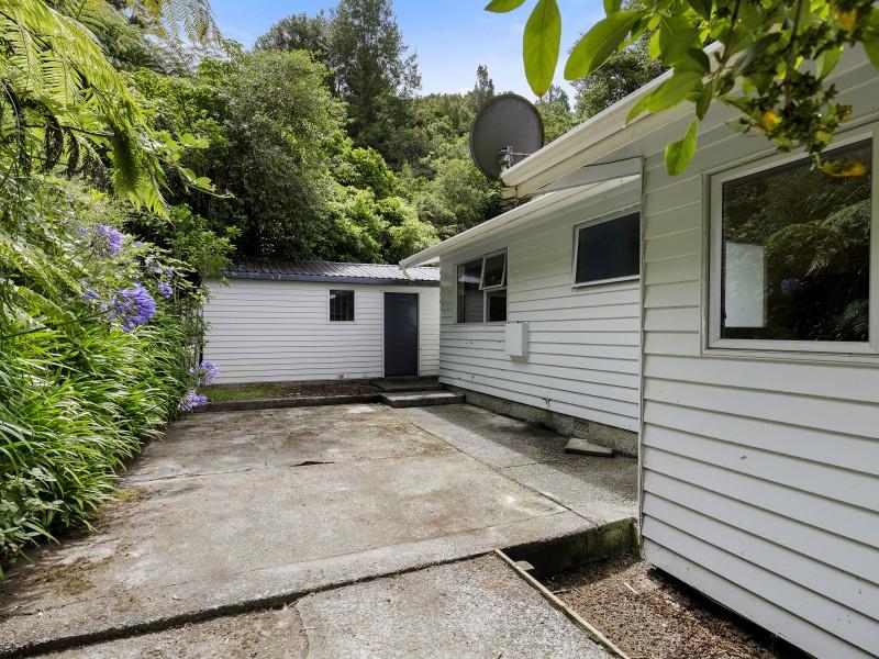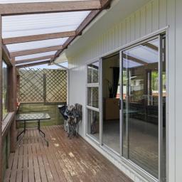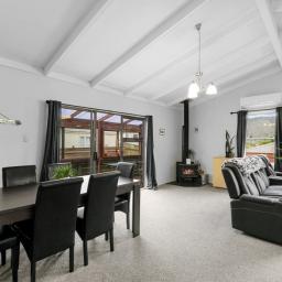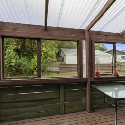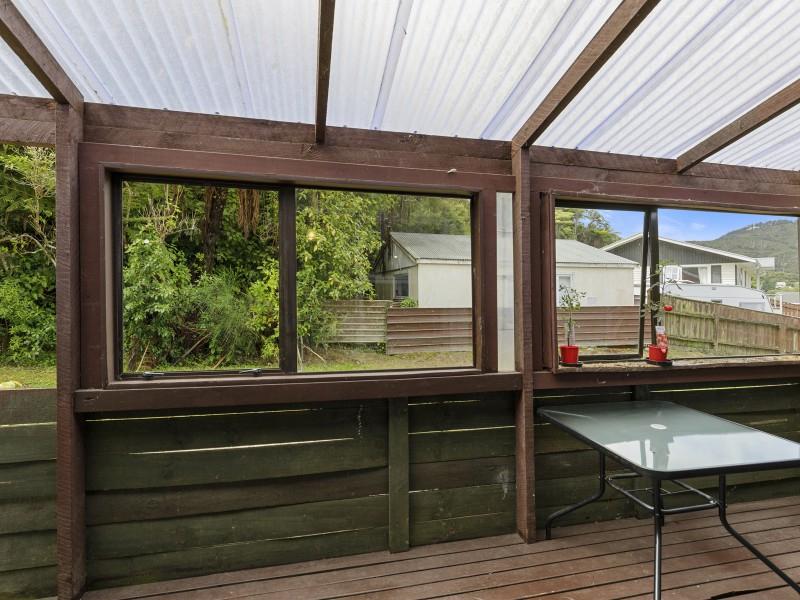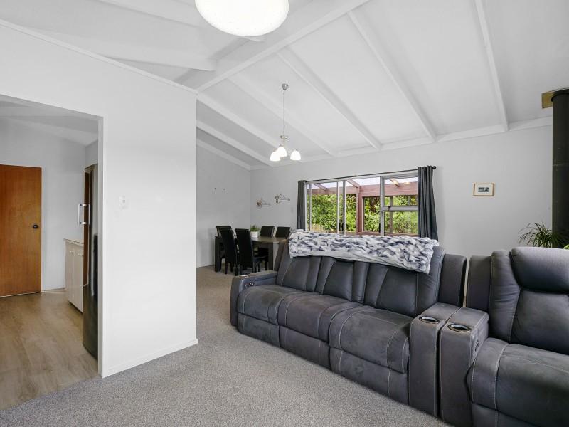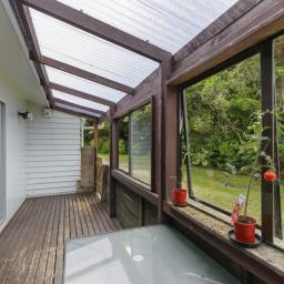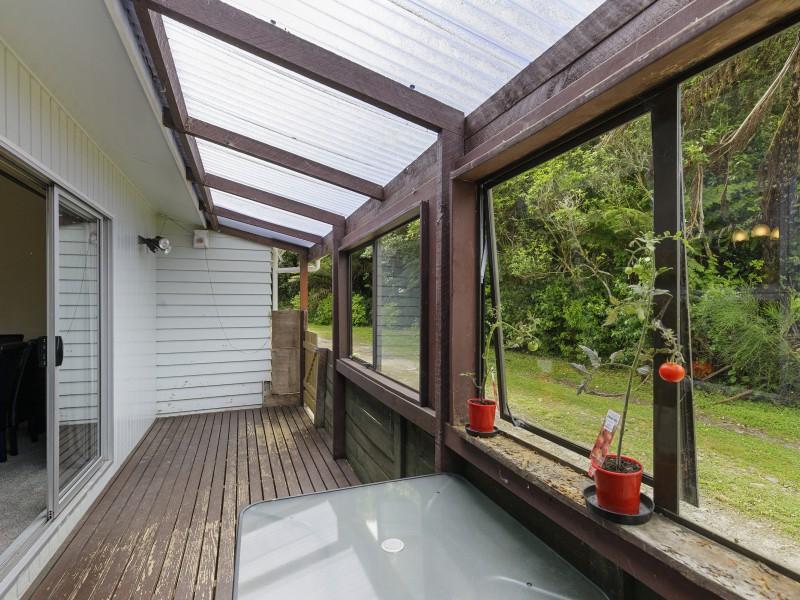 Covered deck area that extends from the living area, and native bush at the back of the section. Separate garage and parking for 6 cars on the drive way.