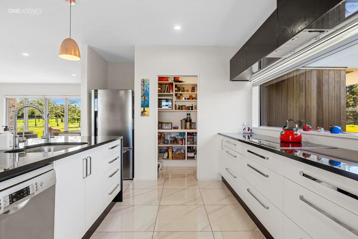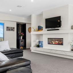 The heart of the home is the spacious open-plan living, with a highly appointed kitchen; featuring an induction cooktop, two ovens plus a warming drawer, filtered water tap with instant hot and cold water, and a walk-through scullery with sink, it's a space designed for both everyday living and entertaining. Two separate living areas are cleverly divided by a striking feature wall that houses a double-sided Escea gas fireplace, complemented by a woodburner for added warmth and ambience.