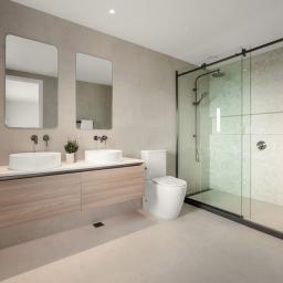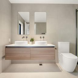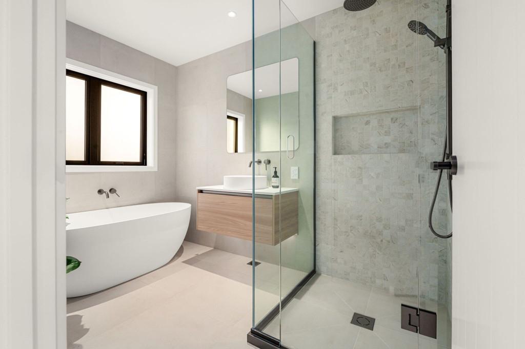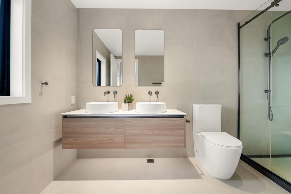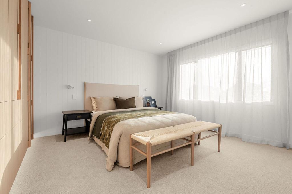 There's a powder room at ground level, and a family bathroom and separate toilet servicing the first-floor bedrooms, which have custom built-in storage organisers. The master bedroom doesn't disappoint. Hardiegroove feature wall adds texture, and the ensuite features a double shower with dual rainwater shower heads.