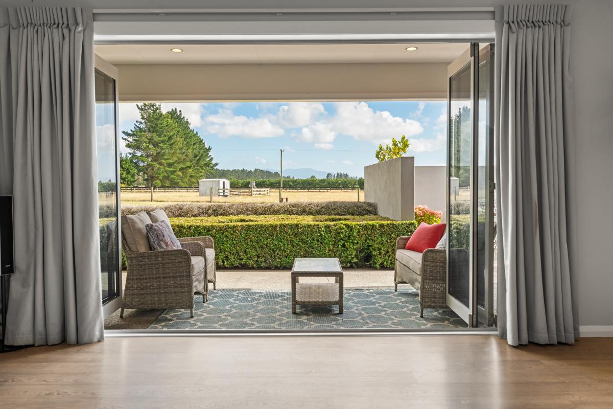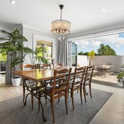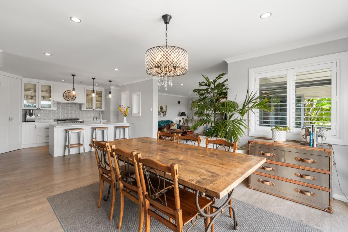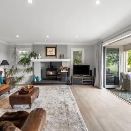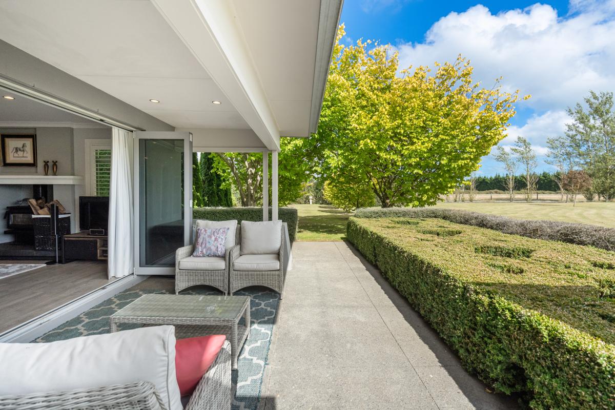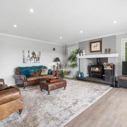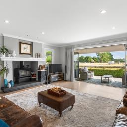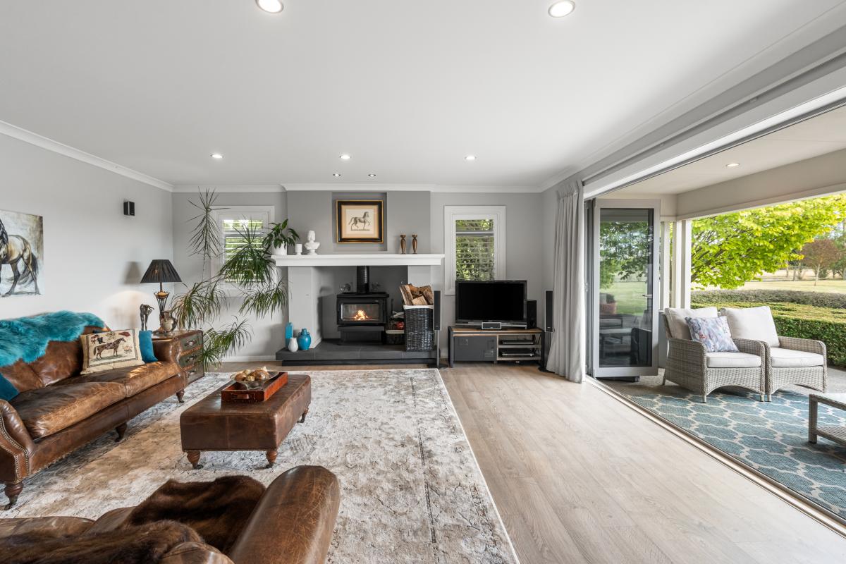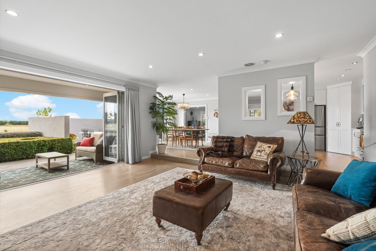 Open-plan dining and living is led by a classically styled kitchen centred on a 900mm designer stove, while sweeping bi-folds off both the dining area and the fire-warmed lounge open to a screened courtyard and a sheltered veranda suited to gatherings across the seasons.