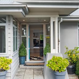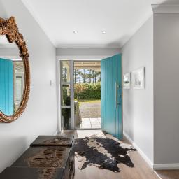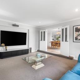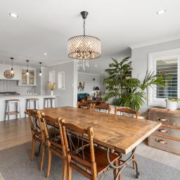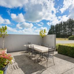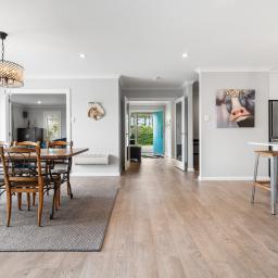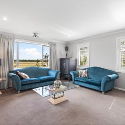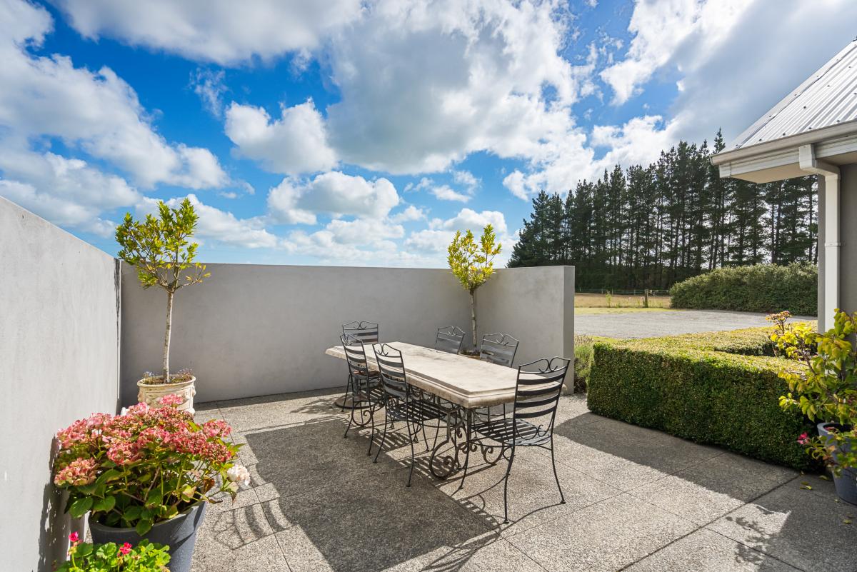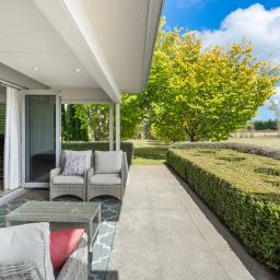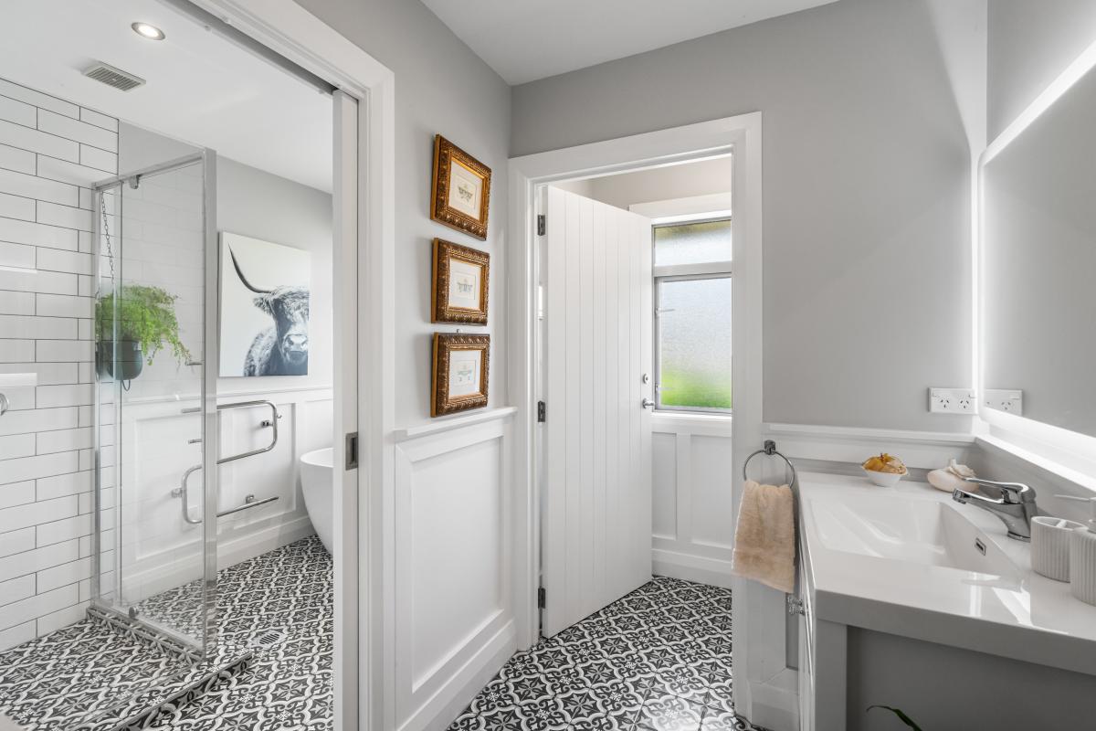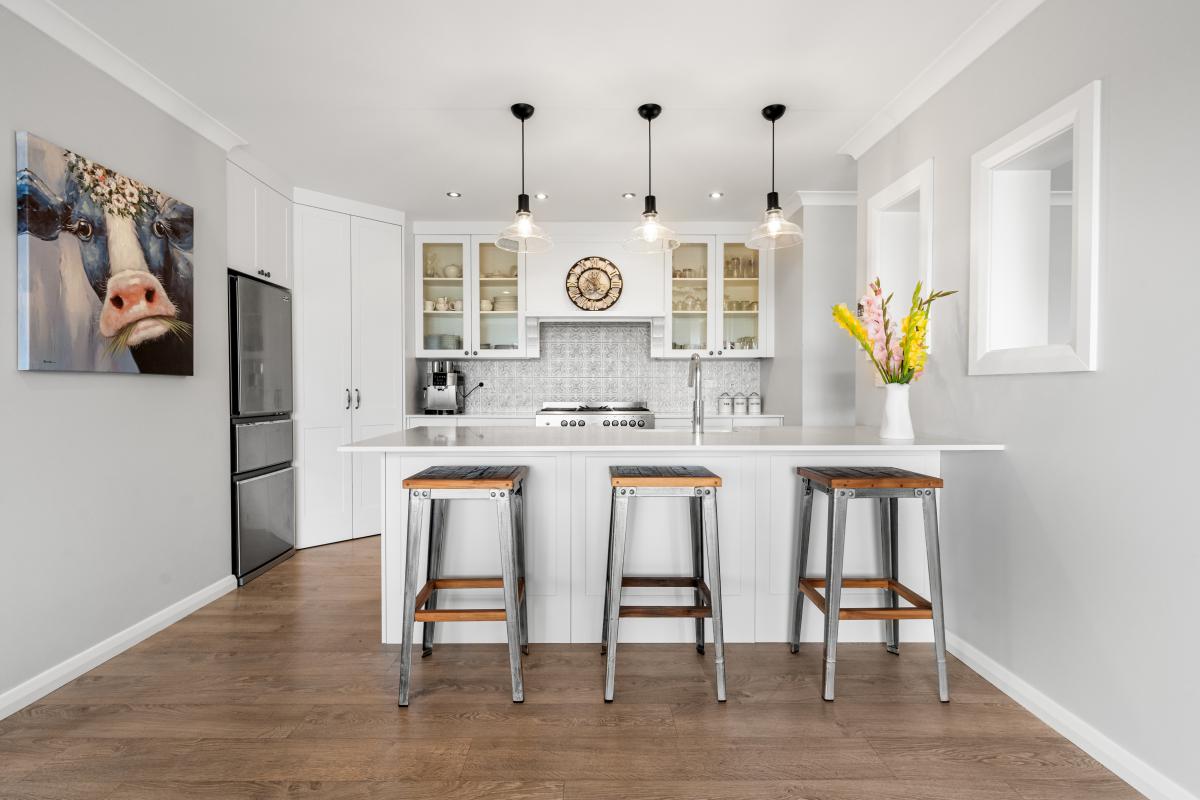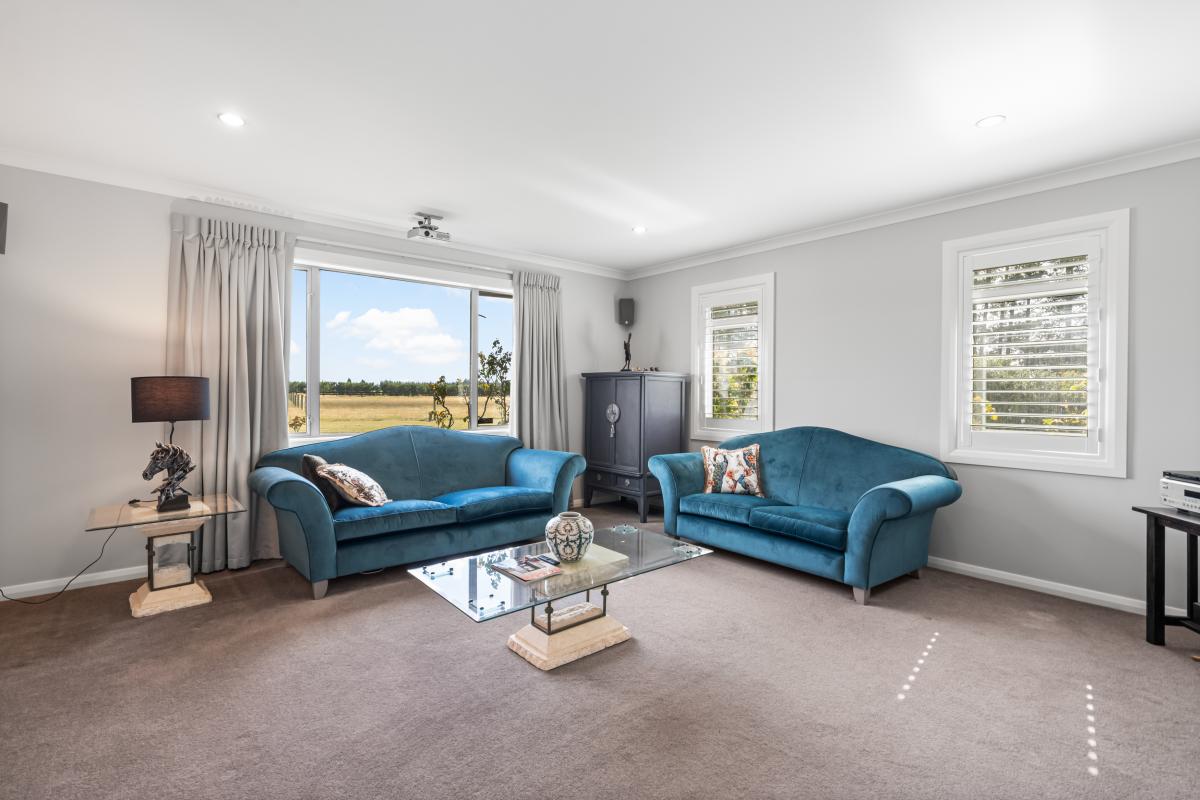 Open-plan dining and living is led by a classically styled kitchen centred on a 900mm designer stove, while sweeping bi-folds off both the dining area and the fire-warmed lounge open to a screened courtyard and a sheltered veranda suited to gatherings across the seasons.