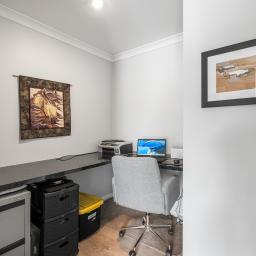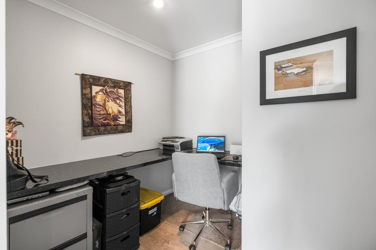 A formal lounge with surround sound adds a different dimension to downtime, complemented by a private office, a separate laundry, and a double garage with a drive-through door that streamlines movement across the property.