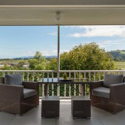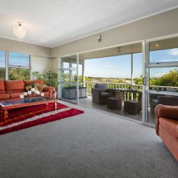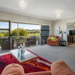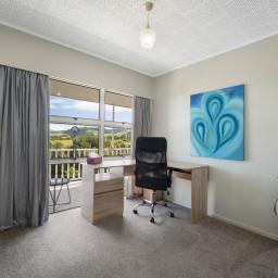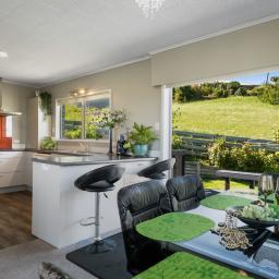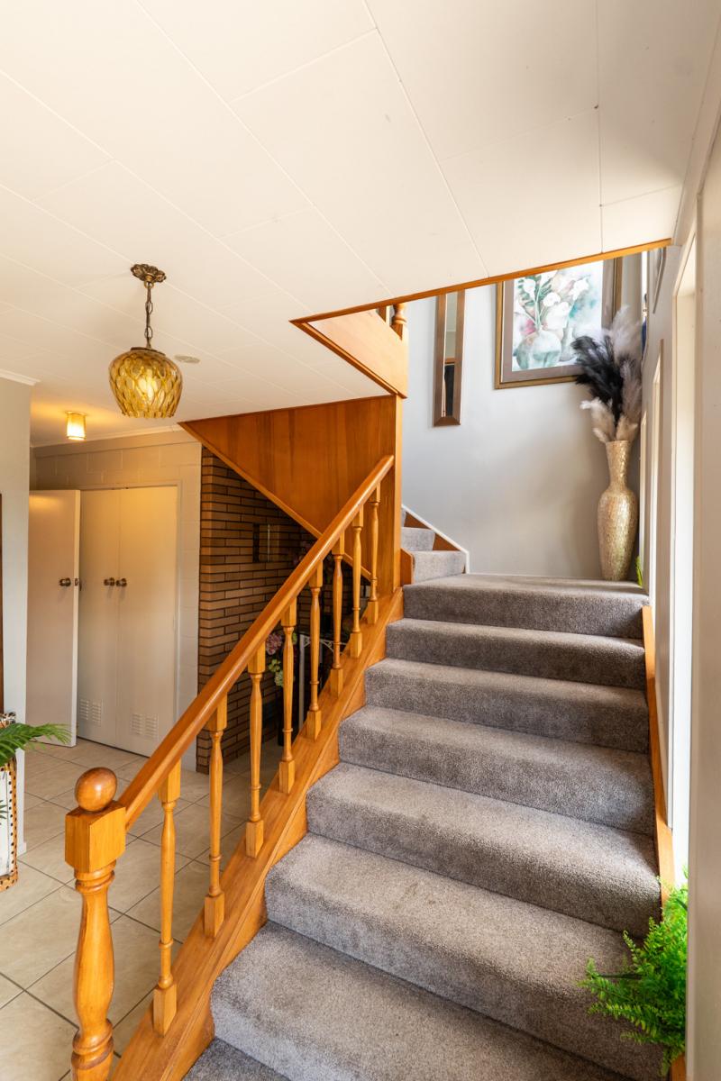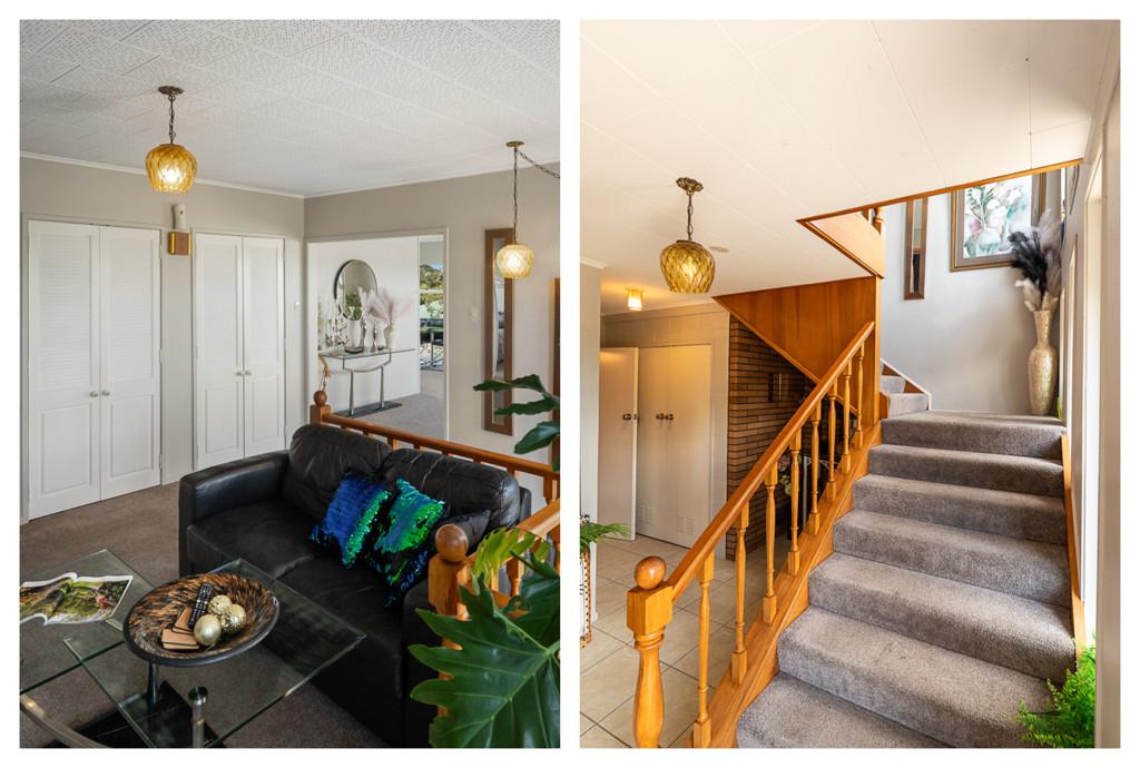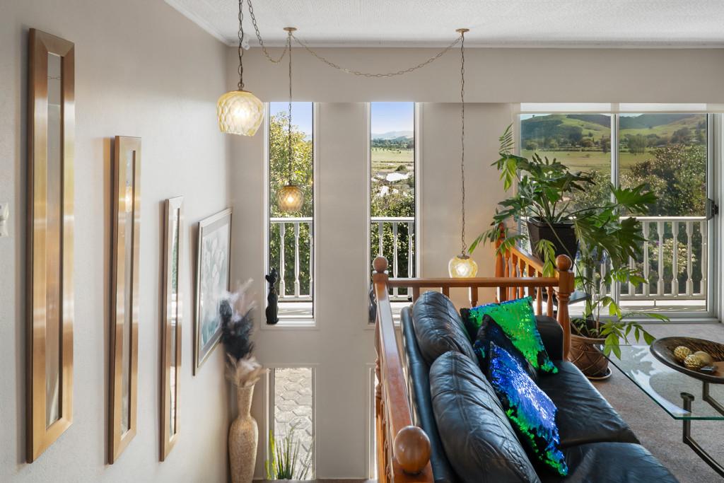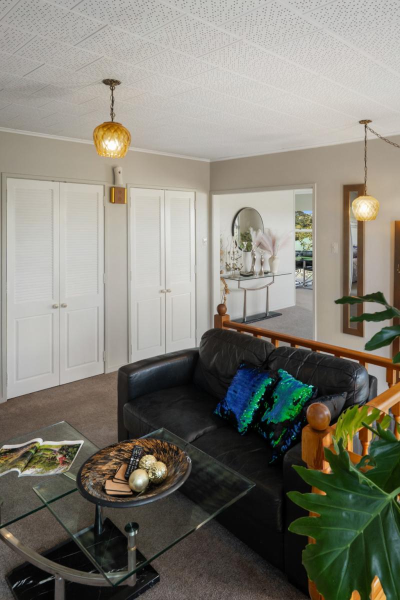 Ascending to the upper level, the heart of the home is revealed: expansive open-plan living areas designed to capture uninterrupted views across Paeroa, rolling farmland, and the striking Black Rock Hills in the distance. The modern kitchen is equipped for contemporary living, flowing effortlessly into the dining area and out to a rear entertaining deck overlooking the backyard. A family room on the landing provides a versatile retreat for casual lounging, children's play, or creative pursuits.