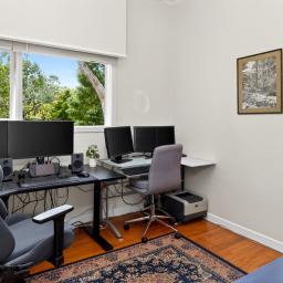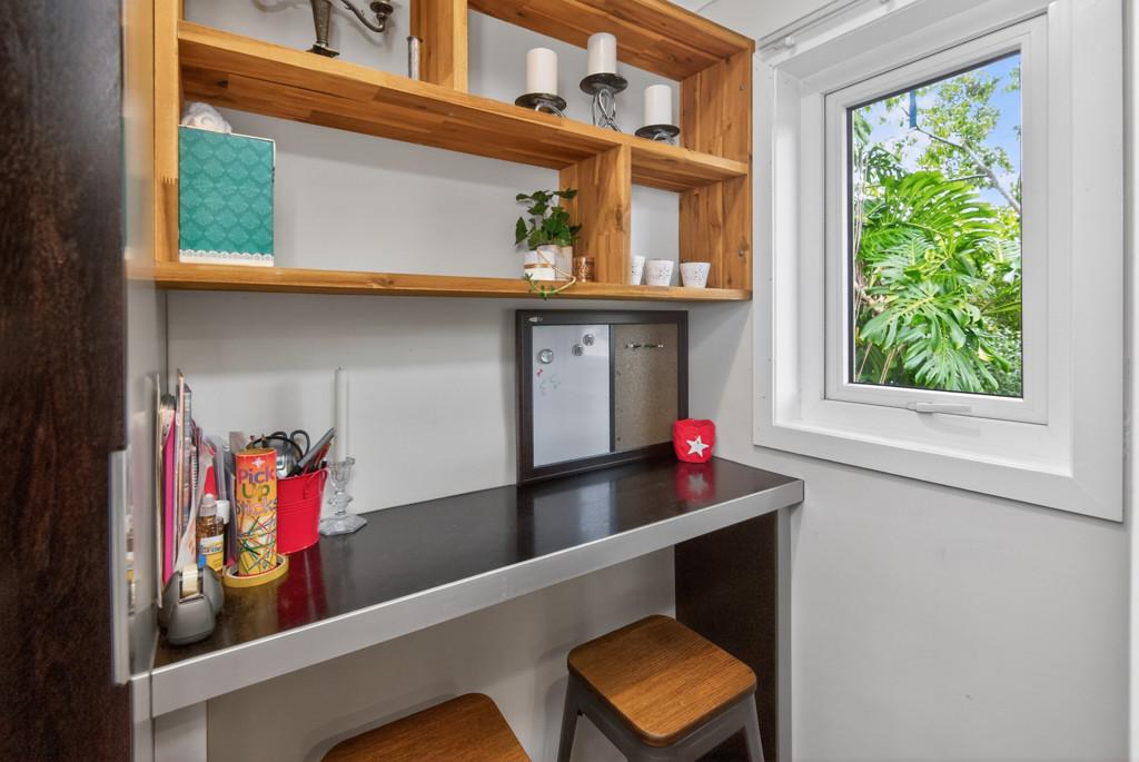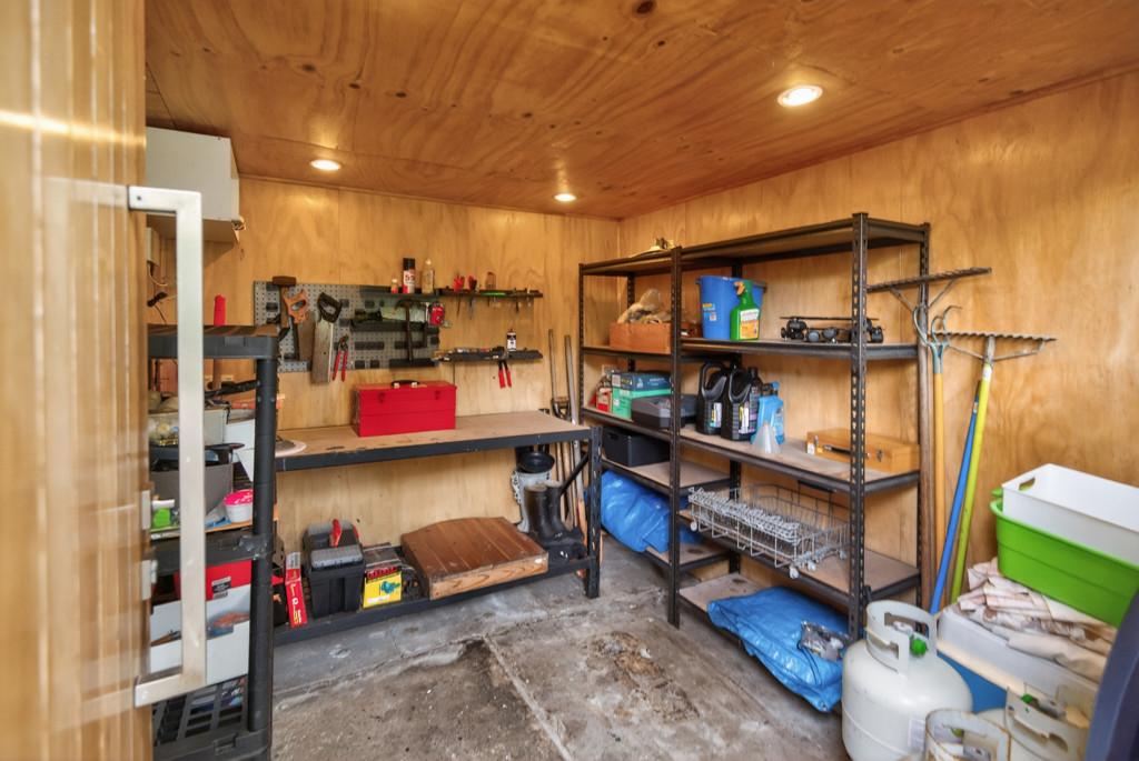 A converted garage offering options as a sleepout or office, complemented by a separate workshop with cabinetry and its own external entry.