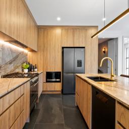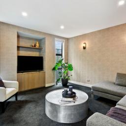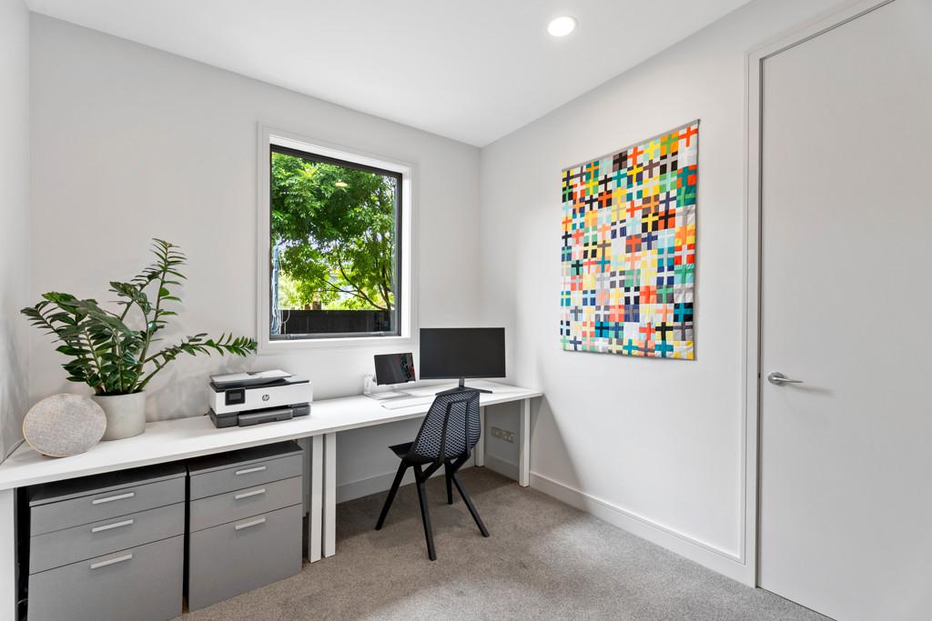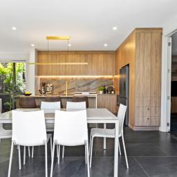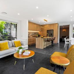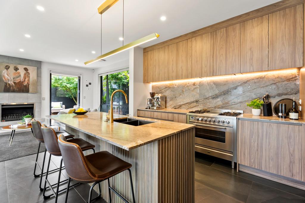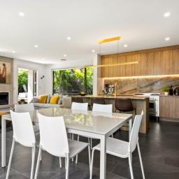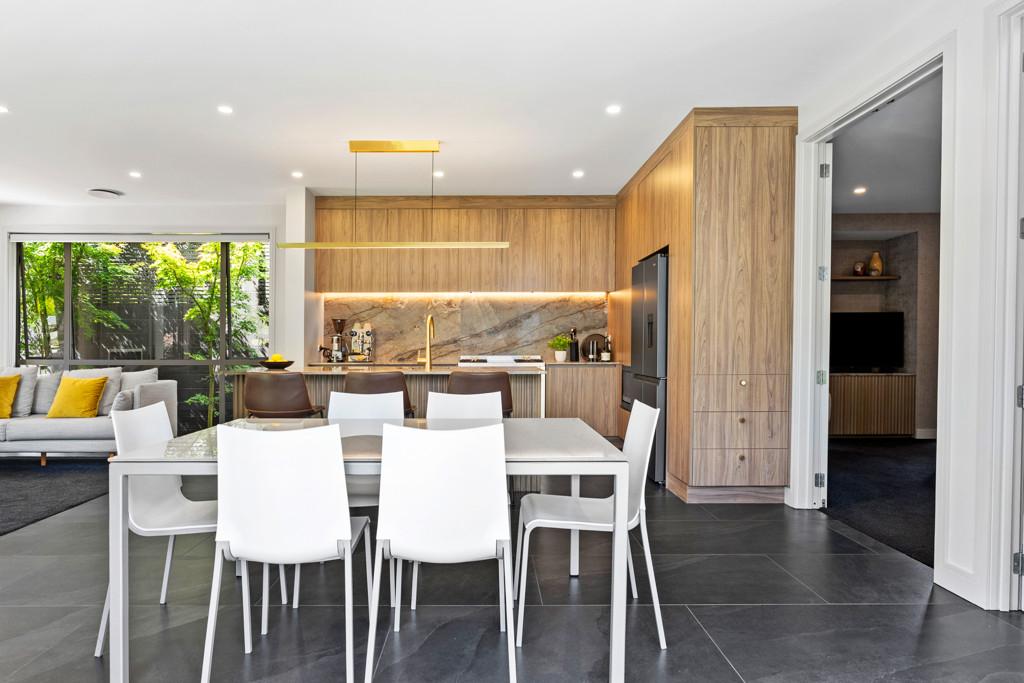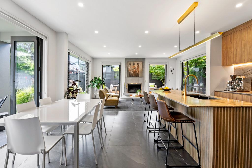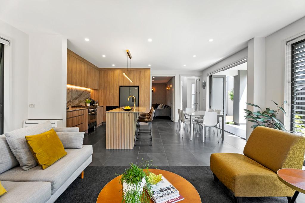 Designed for everyday living and easy entertaining, the ground floor centres around a generous open-plan kitchen, living and dining space. The recently renovated kitchen is finished to a high standard with marble benchtops, extensive storage and a layout that works equally well for family life or hosting. Generously sized doors open to an outdoor deck area and manicured courtyard, where a water feature provides a calm, private backdrop. Floor-to-ceiling windows bring in abundant natural light throughout the living spaces, while a second separate lounge offers a quieter place to unwind.