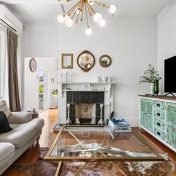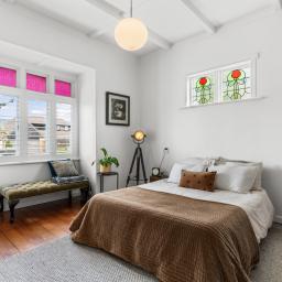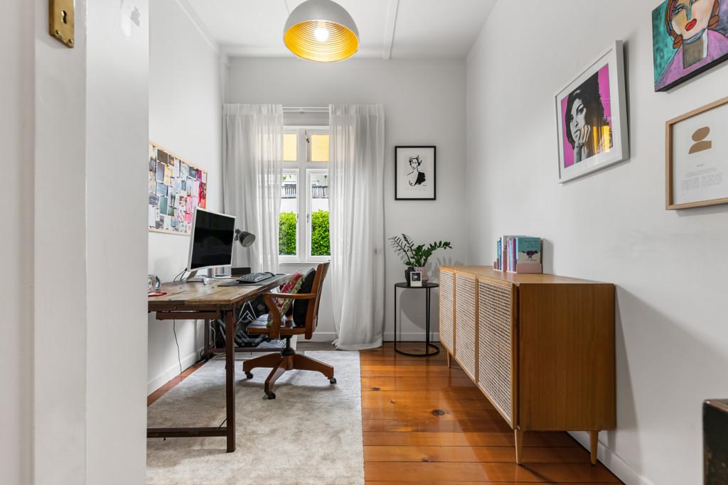 High stud ceilings create volume throughout the interior, complemented by polished timber floors and preserved leadlight windows that filter light with subtle character. Three generous double bedrooms include integrated storage, while a fourth room offers flexibility as a bedroom or private workspace. Two contemporary bathrooms are quietly refined, including an ensuite to the main bedroom.
