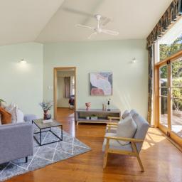 At the heart of the home, the open-plan kitchen and dining area flows into the welcoming front living room - perfect for everyday connection. A separate second living room opens directly onto a sun-drenched deck, offering an ideal spot for entertaining or relaxing in the warmth. A wood burner adds cosy ambience during the cooler months.