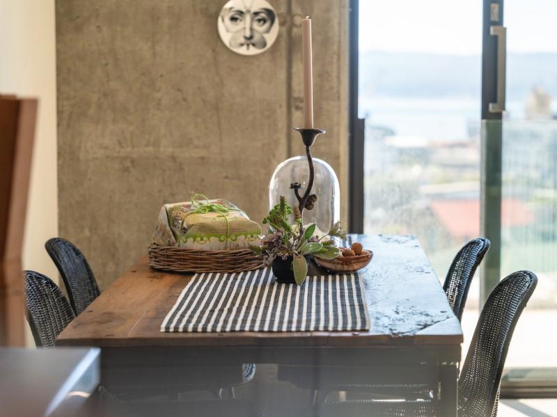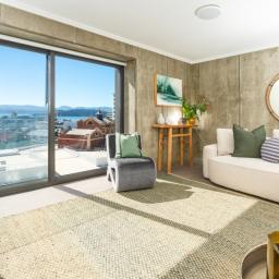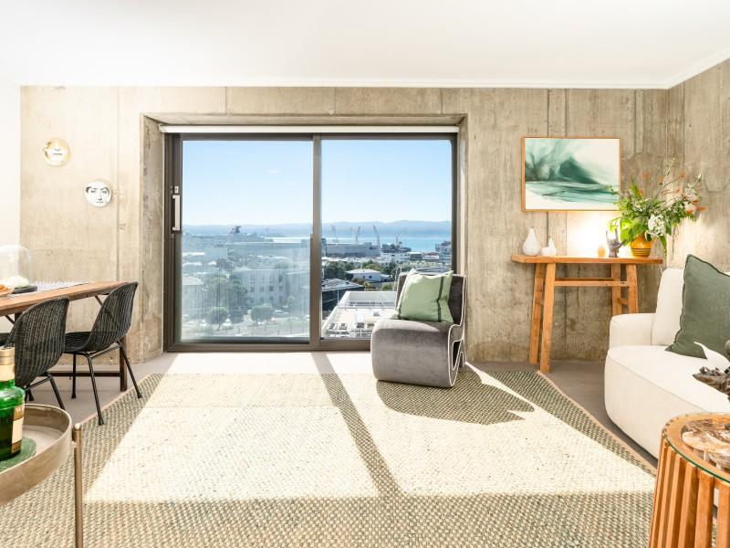 Inside, the design is contemporary and confident, with a striking exposed concrete wall adding a subtle brutalist edge to the living space. Floor-to-ceiling sliding windows frame spectacular views across the city and harbour - an outlook that instantly softens the pace of the day and creates a true sense of escape from the activity below.