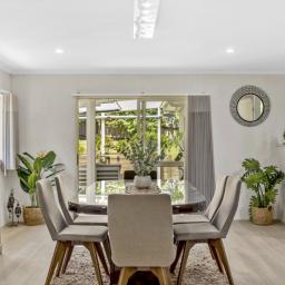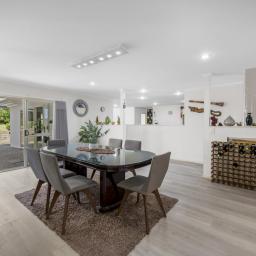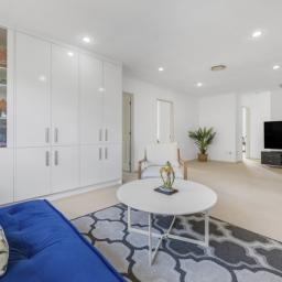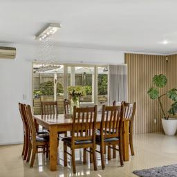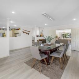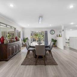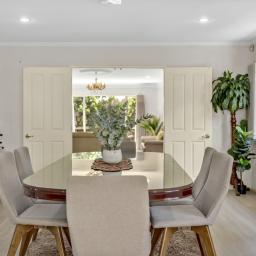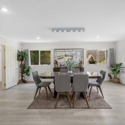 At its heart, the kitchen brings everyone together. Thoughtfully appointed with a gas cooktop, generous benchtop space, and ample storage, it flows seamlessly into the dining and expansive family living area, which is generously sized to comfortably accommodate a formal dining table. Ranch sliders in both the dining and family areas open out to a covered outdoor patio, effortlessly blurring the line between indoors and out, creating a perfect space for entertaining and family living.