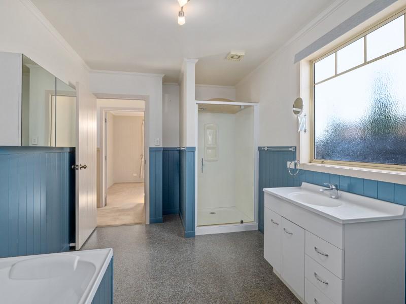 Accommodation is well catered for with three generous double bedrooms. The master bedroom enjoys the convenience of a walk-through wardrobe and direct access to the main bathroom, which includes both a bath and separate shower. A second separate toilet and vanity, positioned near the back entrance, adds practicality for guests and daily living.