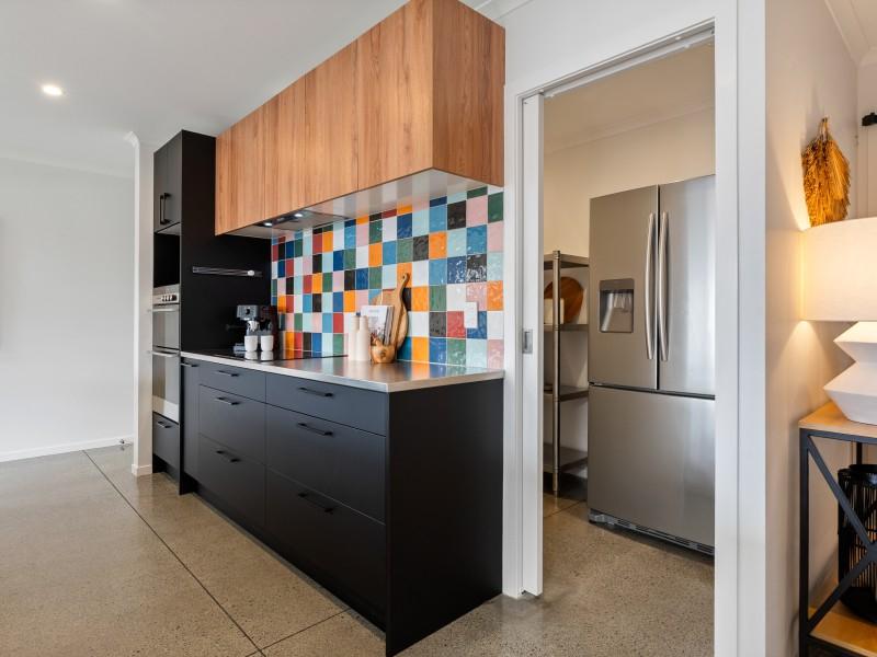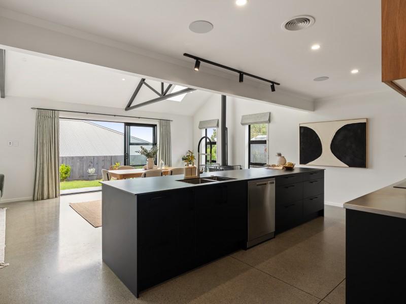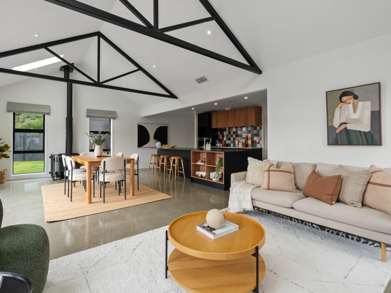 At the heart of the home is a stunning open-plan kitchen designed to impress. Complete with a walk-in pantry and generous bench space, it anchors two adjoining living areas that transition effortlessly between relaxed family time and entertaining. One lounge can be closed off with a striking barn-style door for added flexibility, while the second living area features a beautiful high cathedral ceiling that enhances the sense of space and architectural interest.
