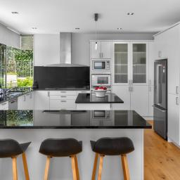 The statement kitchen is superbly appointed with premium Gaggenau appliances, expansive benchtops and ample storage, complemented by a supersized laundry and additional storage that reflect the home's practical luxury.