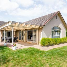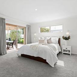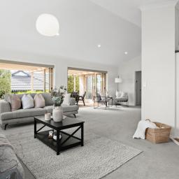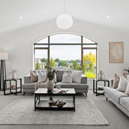 Inside, the living zone is superbly positioned to the north, drawing in daylight throughout the year. Raked ceilings lift the space, giving the open plan a sense of volume, while arched glazing softens the lines and brings light deep into the home. The kitchen anchors the open plan. Gas cooking, a breakfast bar and clear sightlines keep it connected to both the living area and outdoors. It is practical, composed, and designed to be used. The lounge is warm and inviting, centered around a gas fire and supported by air conditioning to ensure year-round comfort. Dual sets of stacking bifold doors open to the sheltered alfresco area, allowing the interior to extend naturally outdoors.