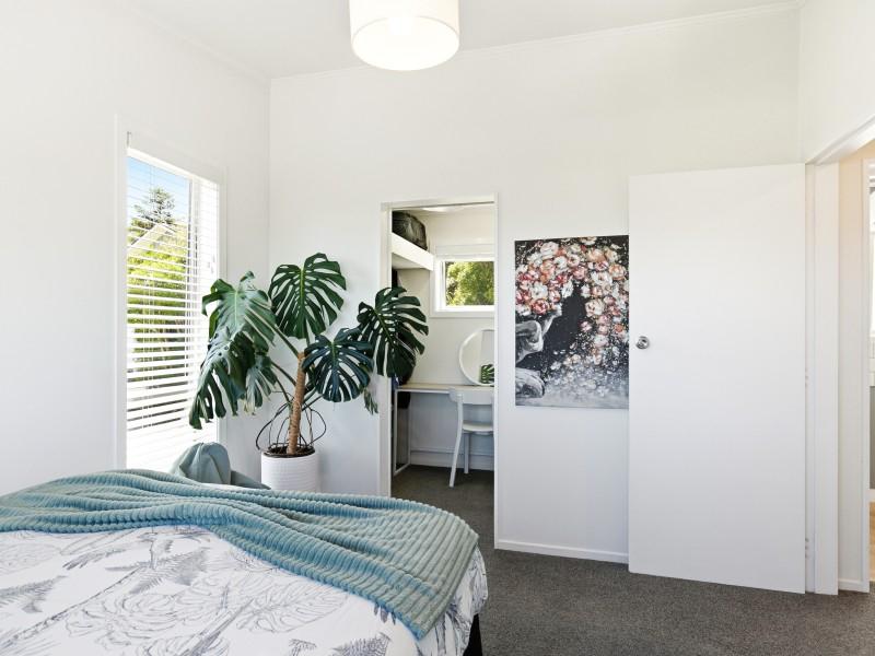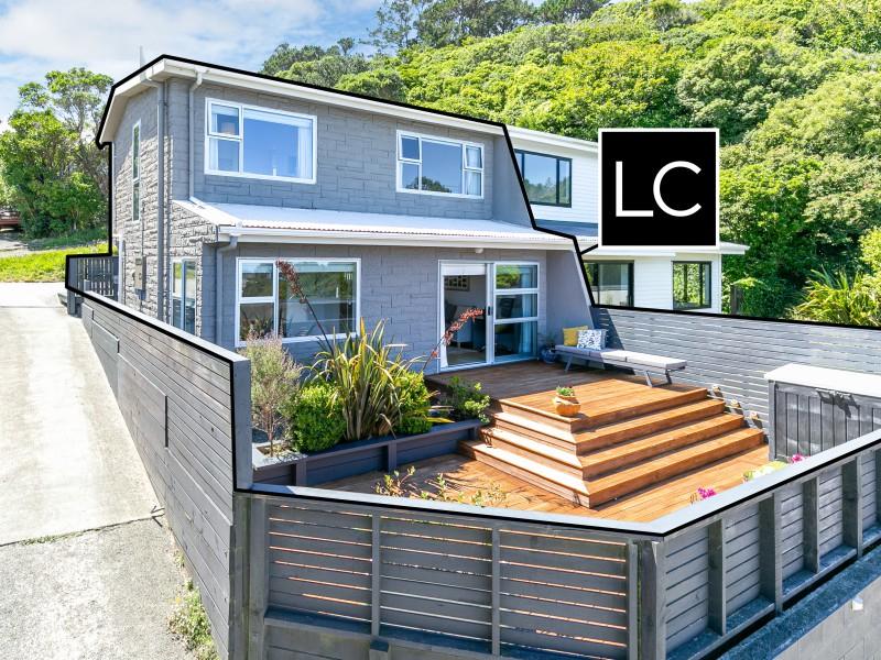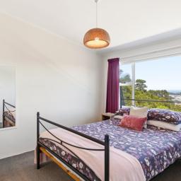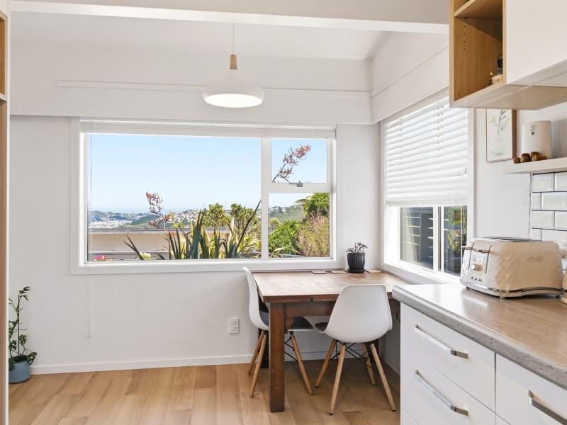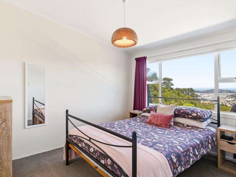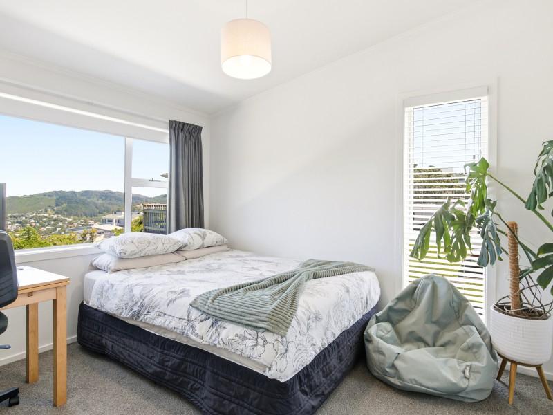 - Two double bedrooms with walk-in wardrobes and commanding views across surrounding suburbs toward the south coast, Cook Strait, and the Brooklyn wind turbine