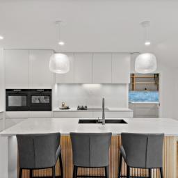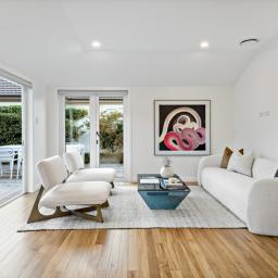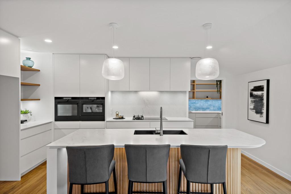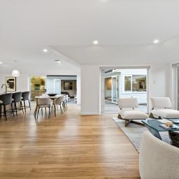 The home sprawls over one level, with an internal-access garage below. An open-plan living, dining, and kitchen space has been tastefully renovated; timber flooring, white walls, and natural neutrals offer tranquility and elegance. The kitchen features a large island, double ovens, induction/gas combi cooktop, and a butler's pantry as large as the kitchen itself to keep any cooking chaos contained. Separated by a barn door is a family room for extra space to live and relax, and decks surround the entire shared area with multiple access points promoting flow from inside to out. The fully ducted system keeps the home cool in summer and warm in winter.