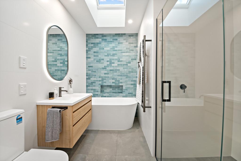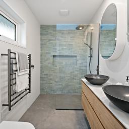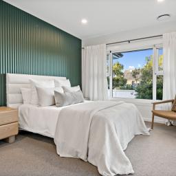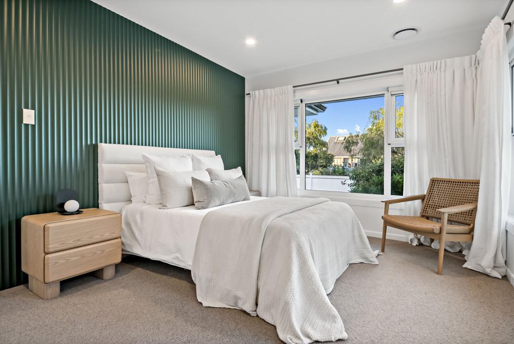 The rest of the level comprises sleeping quarters and bathrooms: the master with attached ensuite and walk-in wardrobe, three more bedrooms, and a family bath. Each is fitted out in comfortable luxury, with chic touches like a green ribbed feature wall and shower tiling adding subtle style. Outside and attached to the main house via decking is the sleepout in a similar style, with two bedrooms, a bathroom, and a sitting room. This unique feature provides flexible options for teens, older generations, visitors, and myriad other scenarios.