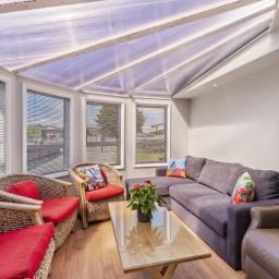 The home connects to the outdoors in a way that feels natural and well considered. A sunroom off the dining area captures outlook to the front of the section, while French doors from both the dining space and separate lounge open onto the deck to the back of the section, making it easy to move between living zones and outdoor entertaining.