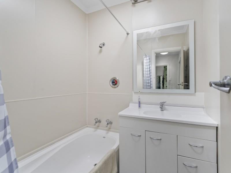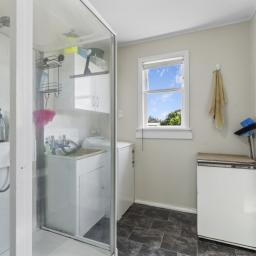The bathroom includes a bath and vanity, while the toilet is positioned separately off the laundry. The laundry itself is a well set up space with a shower unit, tub, storage cupboards, and dryer venting, adding flexibility for everyday living.