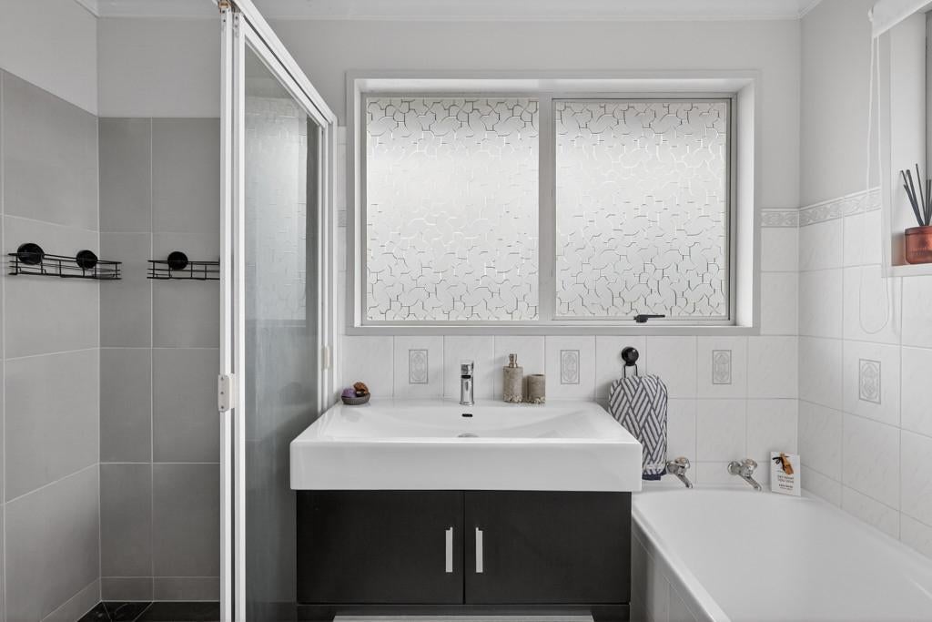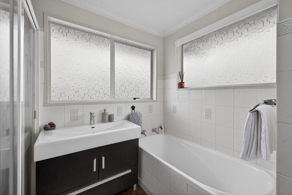 The home features three double bedrooms, each with built-in wardrobes, a large modern kitchen and dining area with excellent storage, and a light-filled main living area enhanced by high ceilings and seamless indoor-outdoor flow to the covered deck - perfect for hosting or relaxed family time. Upstairs is a well-appointed family bathroom with separate shower and bath, plus a separate toilet, while downstairs includes a second bathroom combined with the laundry.