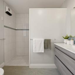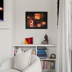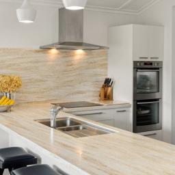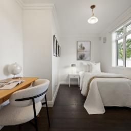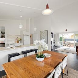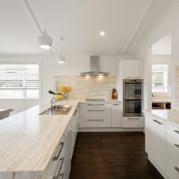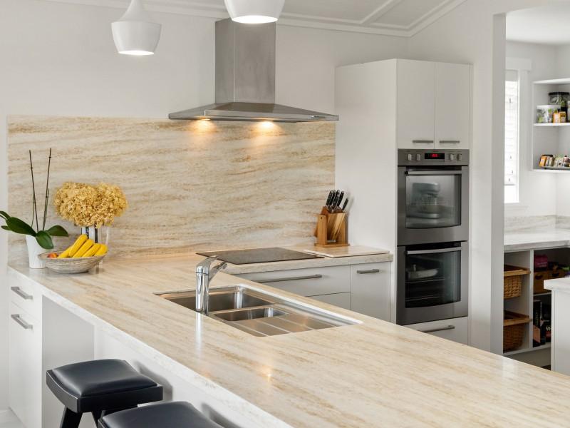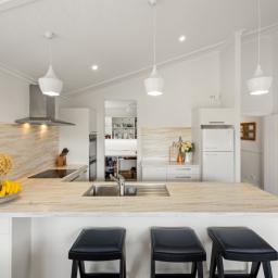 Behind the timeless façade, light-filled interiors feature crisp white finishes, high stud ceilings, and thoughtful detailing throughout. The open-plan kitchen and living area sits at the heart of the home, with stone benchtops, generous workspace, and an easy flow that suits both everyday living and entertaining.