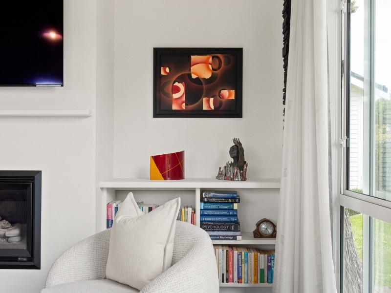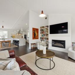The living area is warm and inviting, centred around a cosy fireplace and supported by full insulation for year-round comfort. Large sliders open to a private outdoor entertaining space, creating a seamless connection between indoors and out.