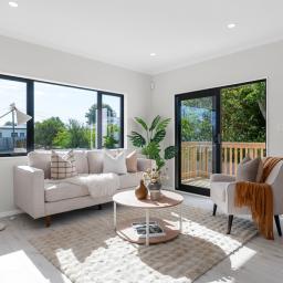 The thoughtfully designed two-level layout leaves nothing to chance. The lower level features a spacious open-plan living area, filled with natural light through generous double glazing. A sleek kitchen with quality appliances, tiled surfaces, and a breakfast bar flows seamlessly to sunny, outdoor space, while a dedicated toilet and separate laundry add to everyday convenience.