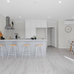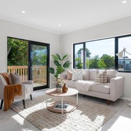 The thoughtfully designed two-level layout leaves nothing to chance. The lower level features a spacious open-plan living area, filled with natural light through generous double glazing. A sleek kitchen with quality appliances, tiled surfaces, and a breakfast bar flows seamlessly to sunny, outdoor space, while a dedicated toilet and separate laundry add to everyday convenience.