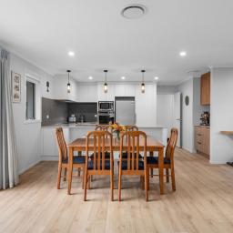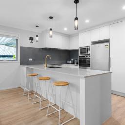 At the heart of it all, the kitchen is designed for connection. Stone benchtops, high-spec appliances and a generous breakfast bar make it easy to imagine morning coffees, casual dinners, and guests naturally gathering while the pizzas cook outside.