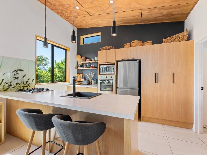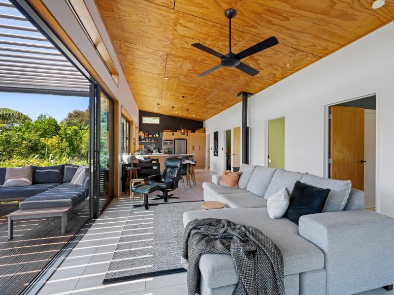 The home itself is warm, modern, and highly efficient. A wetback wood burner and grid-connected solar system work together to reduce energy costs, while the north-facing aspect captures excellent sun year-round. Large windows frame sea views and bring the outdoors in, reinforcing the calm, grounded feel of the property.