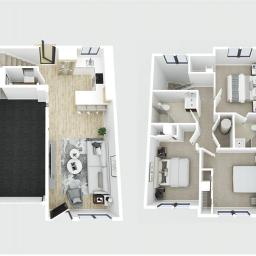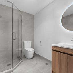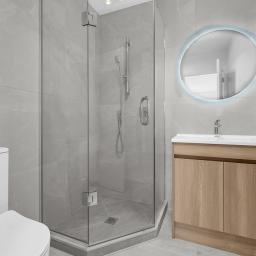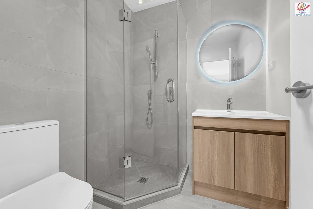 Two sleek, fully tiled bathrooms plus an extra guest toilet