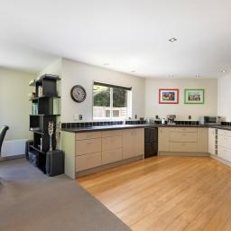 The modern kitchen connects seamlessly with open-plan living and dining, while heat pumps throughout provide year-round comfort with efficient heating and cooling.