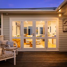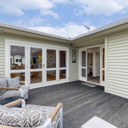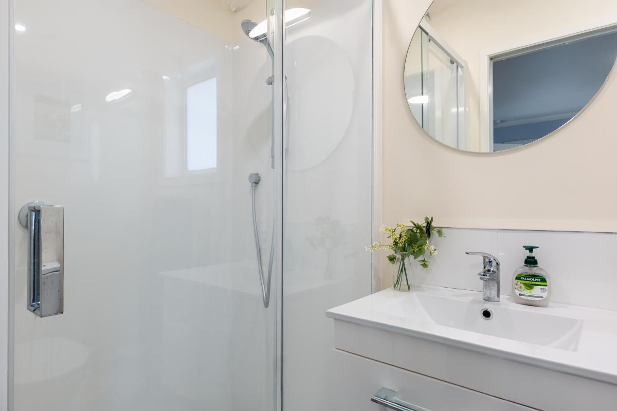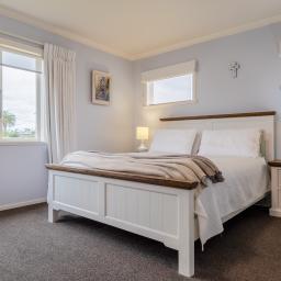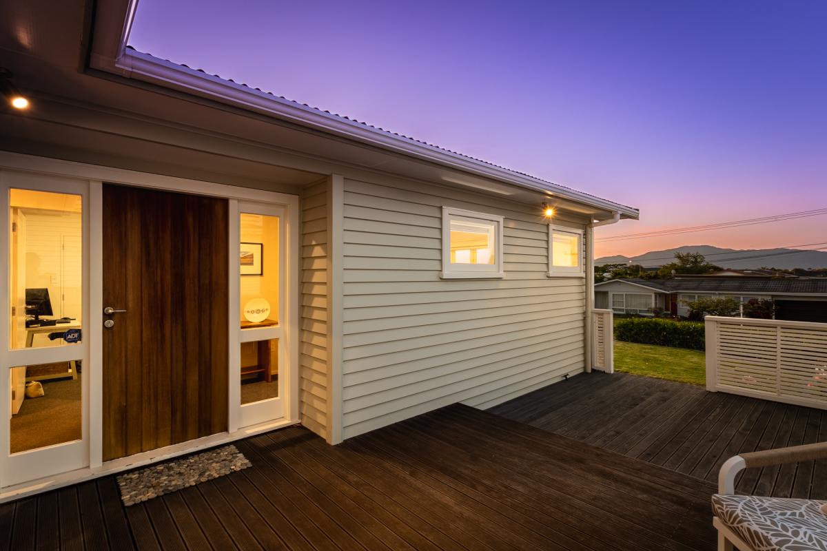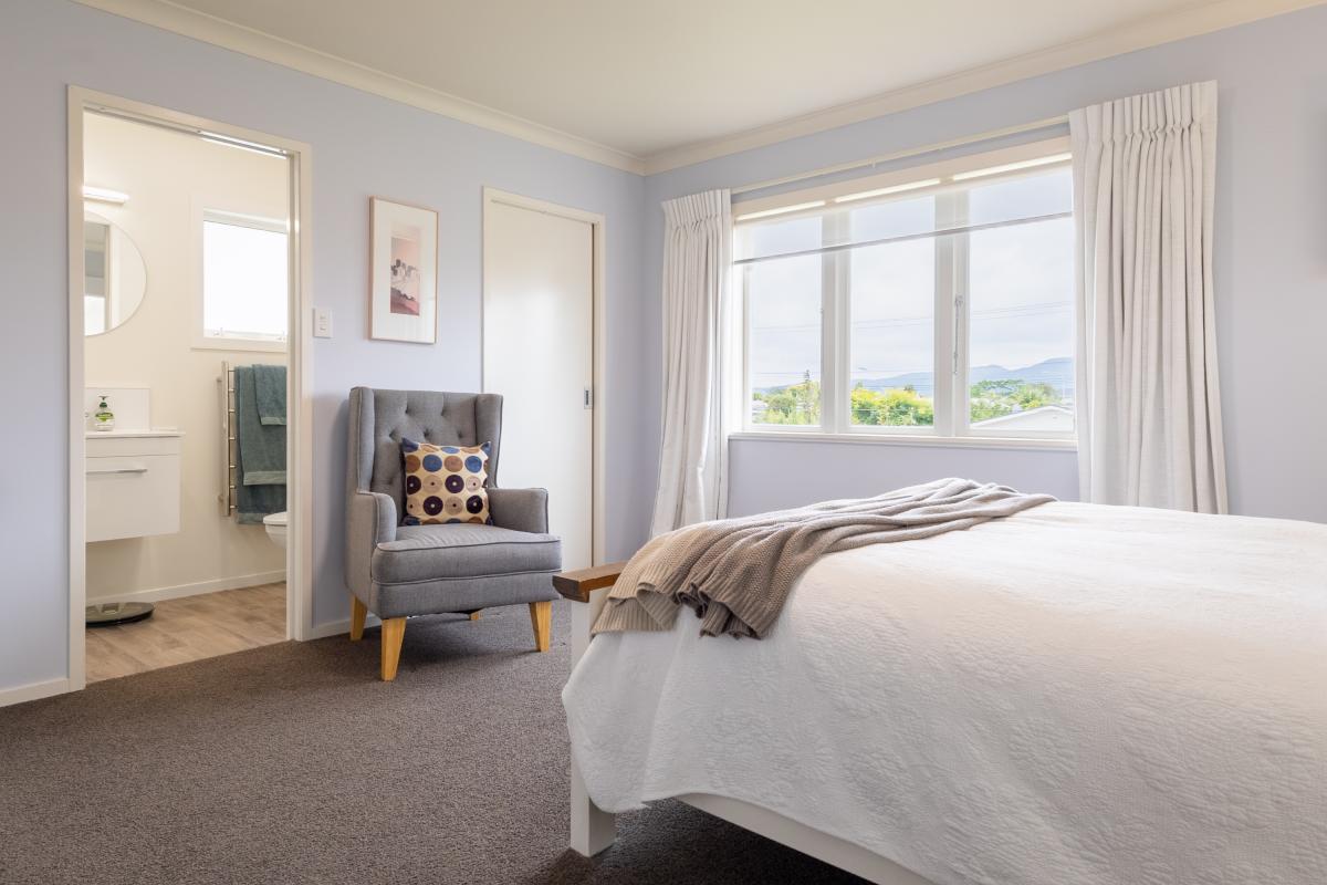 The main bedroom captures a west-facing outlook toward Kapiti Island's contours and now enjoys the addition of a well-integrated ensuite and walk-in wardrobe. Bedrooms are generous doubles, and the layout offers functional separation with thoughtful storage throughout.