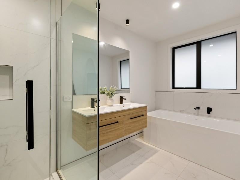 Double garage has a workbench, integrated laundry and attic storage. Modern, sleek and effortlessly stylish, this exceptional home sets a benchmark for contemporary family living.