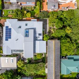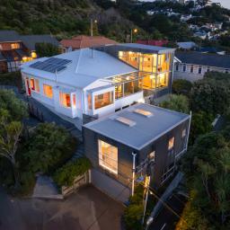 Entry to both dwellings is via a light-filled winter garden, a beautifully resolved response to Wellington's climate that enhances warmth, shelter, and year-round usability.