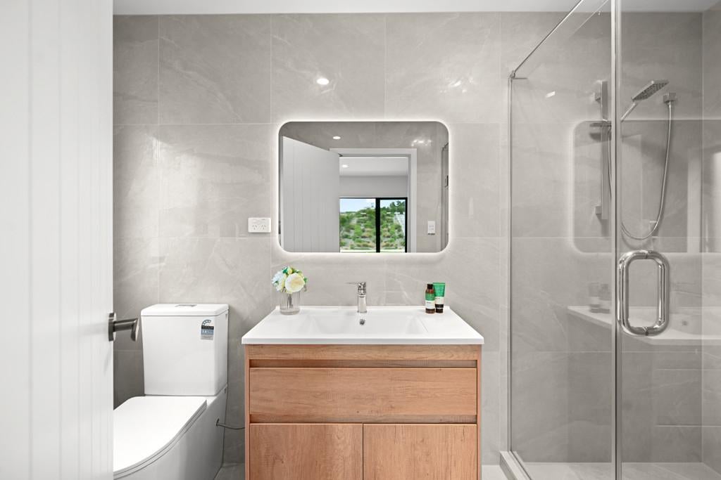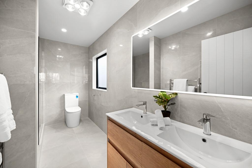 Upstairs, you'll find two spacious master bedrooms, each with a luxurious ensuite and oversized windows to capture the views. There's also a dedicated office nook, perfect for those working from home. Additionally, there is a third guest bedroom downstairs with access to the bathroom, creating a semi-en-suite solution.
