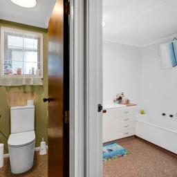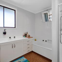 The central bathroom includes a bath, shower, and vanity, while the toilet is separate. A generously sized laundry provides ample storage, adding to the home's practicality.