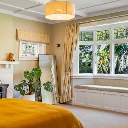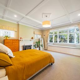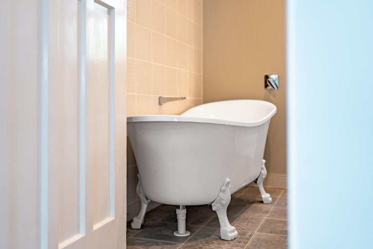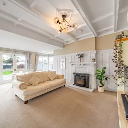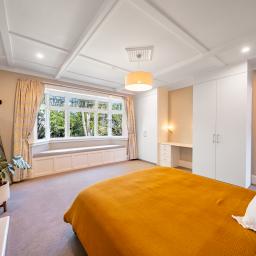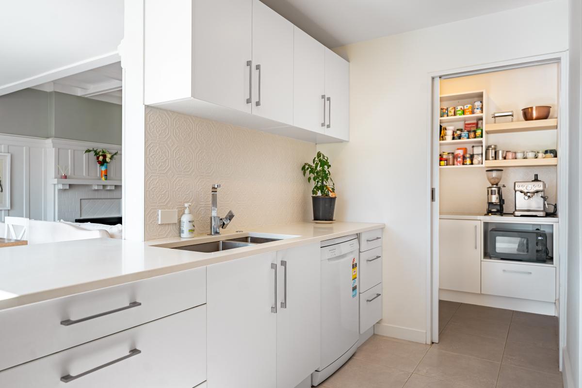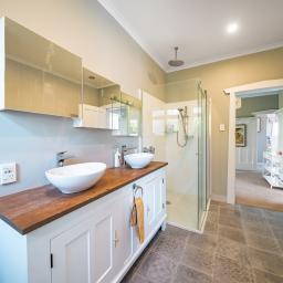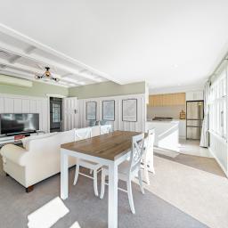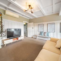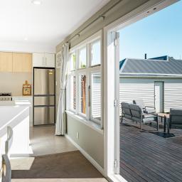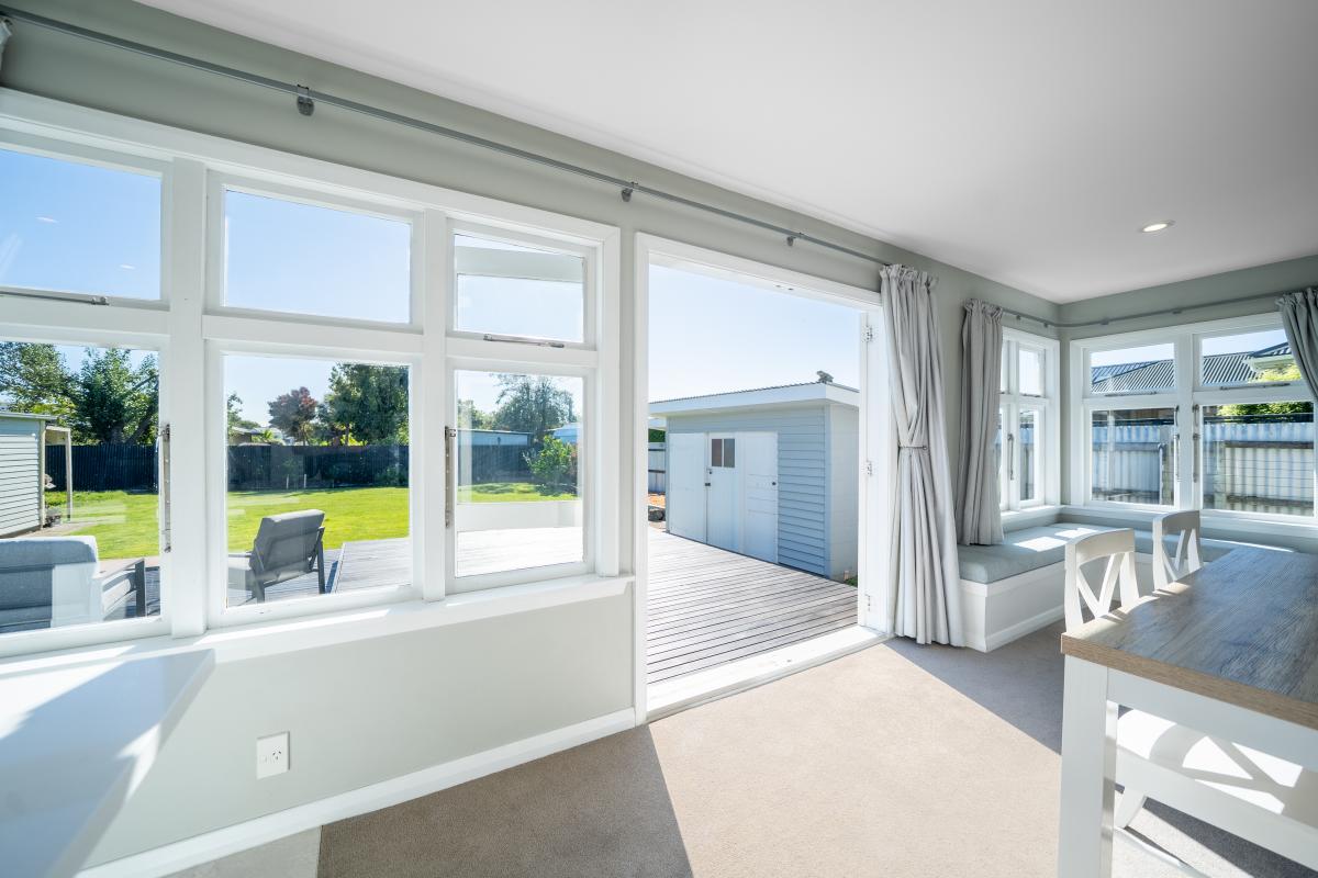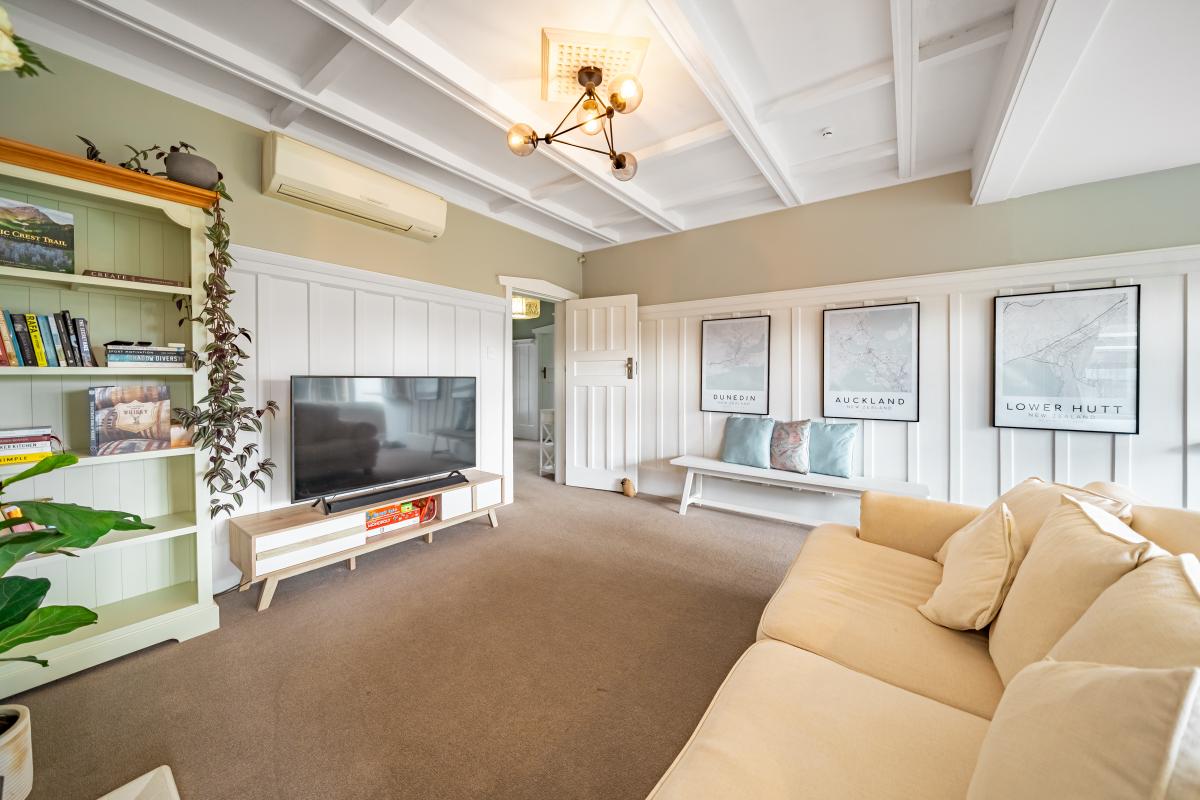 Inside, three genuine double bedrooms are complemented by two bathrooms and a separate study. The main bedroom is exceptionally large and features its own log burner, creating a retreat-like feel during the colder months. A second log burner and a heat pump ensure the rest of the home stays warm in winter and cool through summer. Open-plan living and dining connect easily with a spacious kitchen that includes a walk-in scullery with second sink, while a freestanding five-burner gas hob pairs efficiently with gas hot water. Double doors open to a substantial rear deck, extending the living space outdoors. The renovated bathroom retains character detailing and includes a standalone bath, with a separate laundry adding everyday practicality.