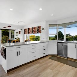 The newly updated kitchen forms a stunning central hub, seamlessly connecting to expansive living areas and