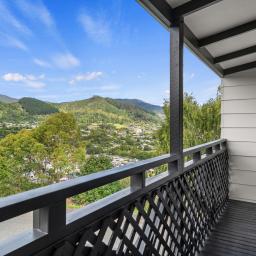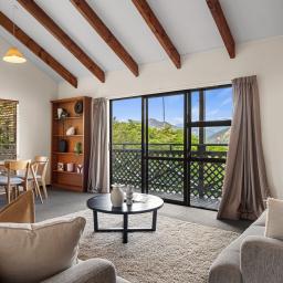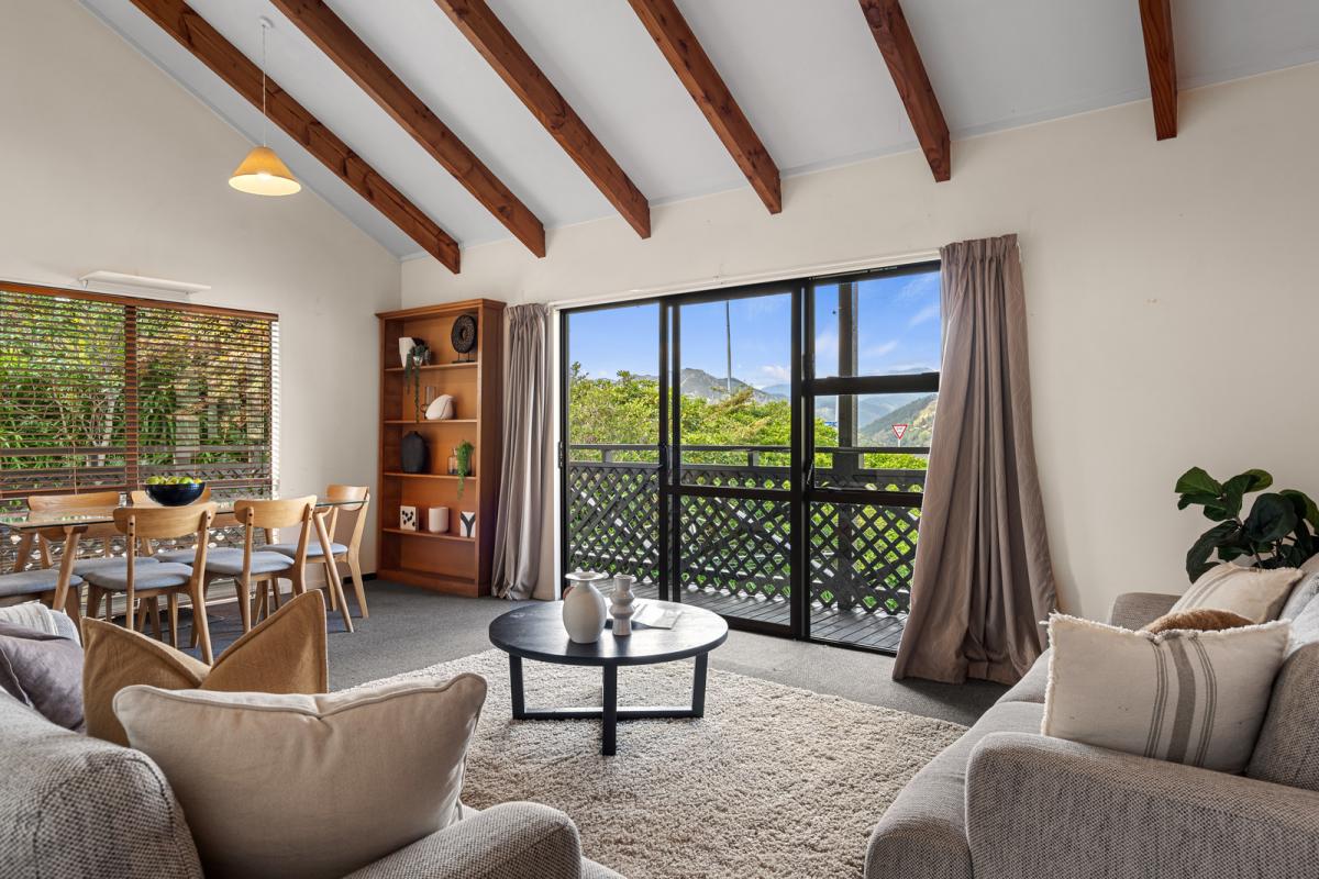 Vaulted ceilings create real volume in the living area, with exposed beams adding character. The open plan layout flows directly to a covered balcony, making the most of the elevation and giving you a front-row seat to the view.