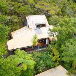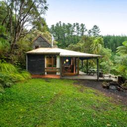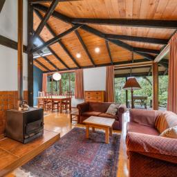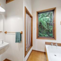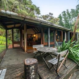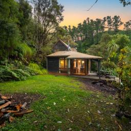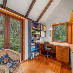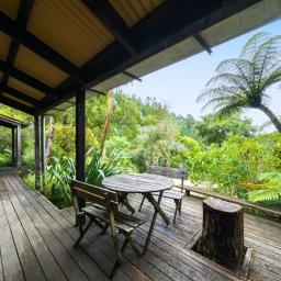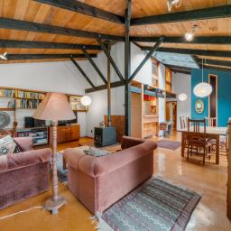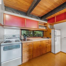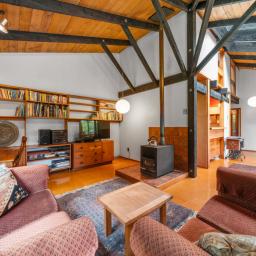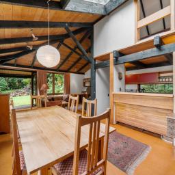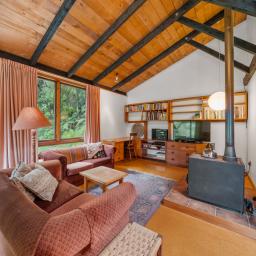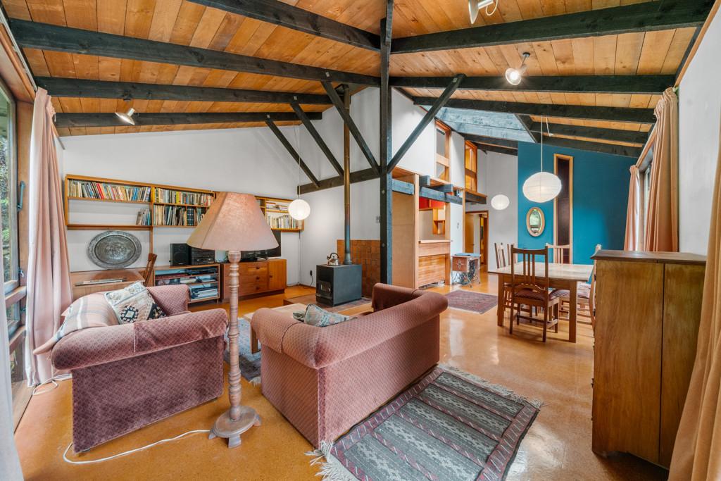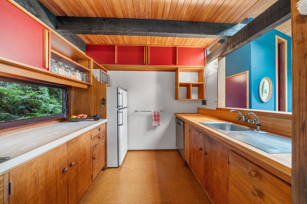 The heart of the home features a separate yet connected kitchen, open-plan dining and living, and a cosy woodburner. This space is complete with casement windows, sliding door and bi-folds that open to a deck, flat outdoor space, and lush native surroundings.